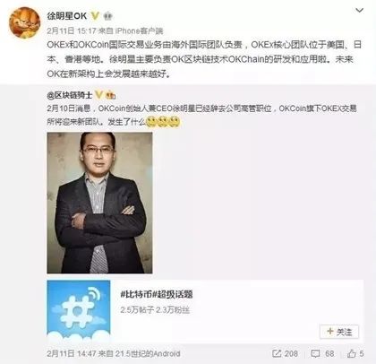 此前不久,多名在虚拟货币交易平台OKEx上进行合约交易的投资者聚集到OKCoin公司楼前讨要说法,一度将徐明星推向舆论的风口浪尖。而对此,OKEx表示,徐明星从未在自己公司任职,与自己无关。