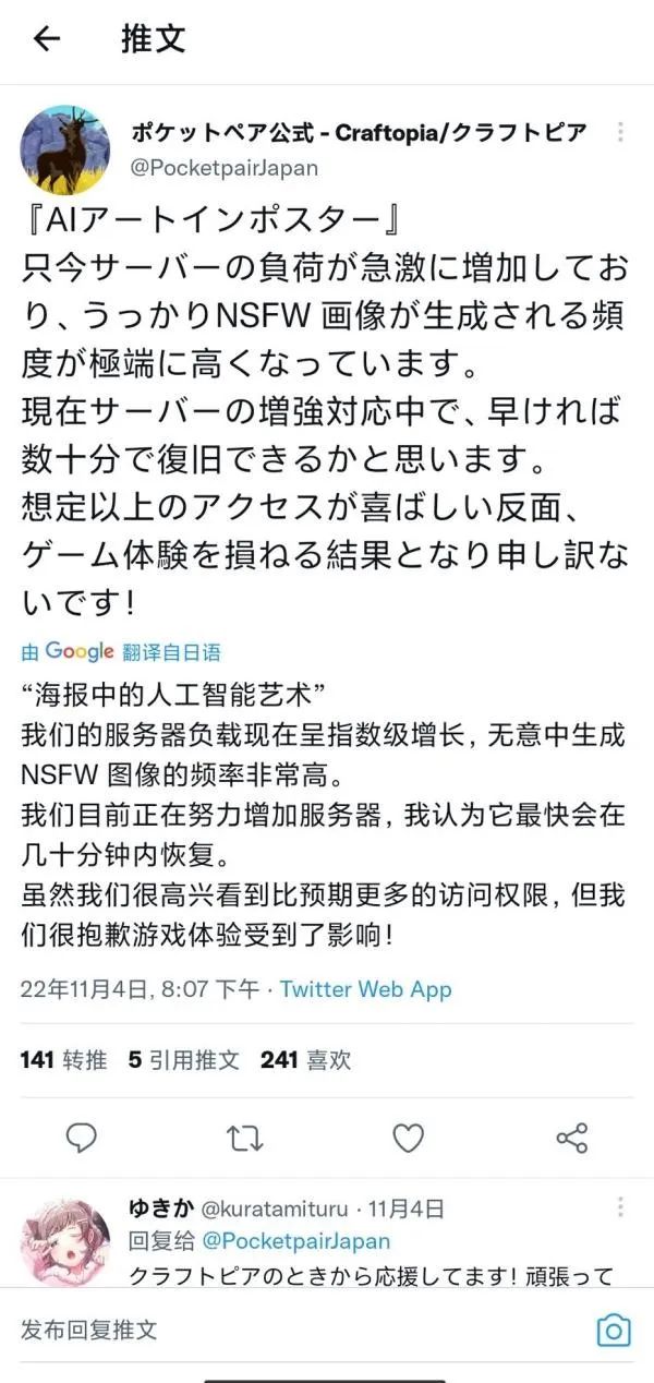 游戏上线初期,服务器过载导致生成敏感图片的概率过高| 图片来源:研发商 Pocketpair 推特