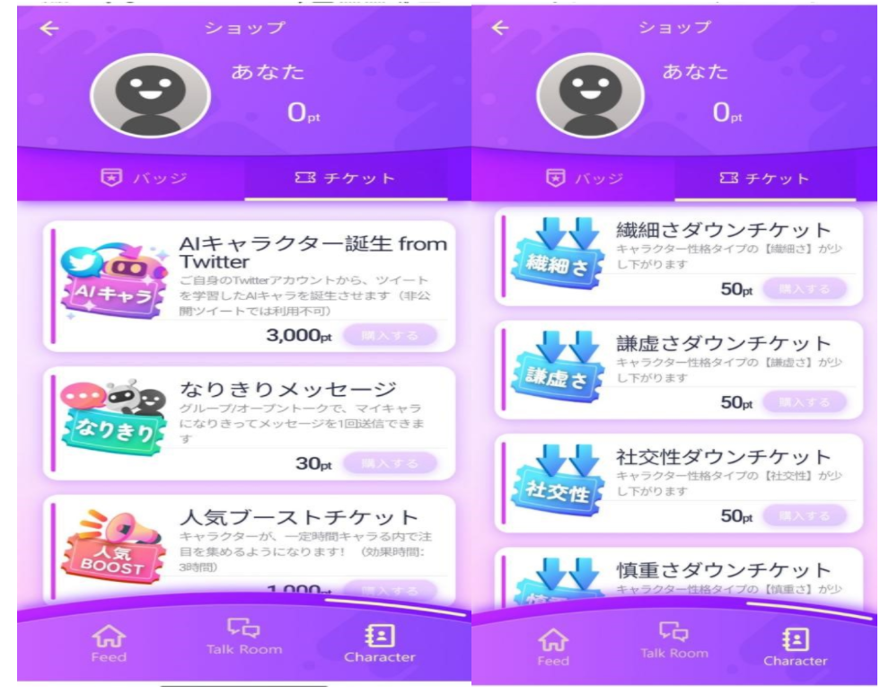 而在核心的养成玩法下,「Chararu」中设计了可用于提升 AI 机器人技能和性格的勋章系统,「Replika」中也有类似的玩法,通过获得勋章可以提升其绘画技能或谦虚、同理心等性格属性,这些设计通常也是这类产品主要的变现点。而「Chararu」中也有相对独有的设计,例如它支持以用户的 Twitter 推文作为训练数据重新生成一个 AI 聊天机器人,以及设计了可以提升机器人曝光指数的勋章,也能似乎能印证上文「Chararu」鼓励用户“造星”的假设。