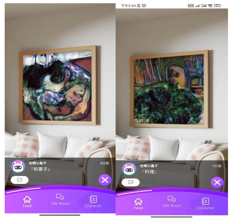 从笔者短暂的观察来看,这些动态的话题一般和 AI 机器人的人设相关。比如笔者将自己的 AI 机器人设定为爱好美食,它便一连几天发布了以 “和果子” 、 “料理”为主题的画作。不过,也许是因为双方没有及时交互,它的画风已经在抽象和热爱深绿的道路上越走越远。
