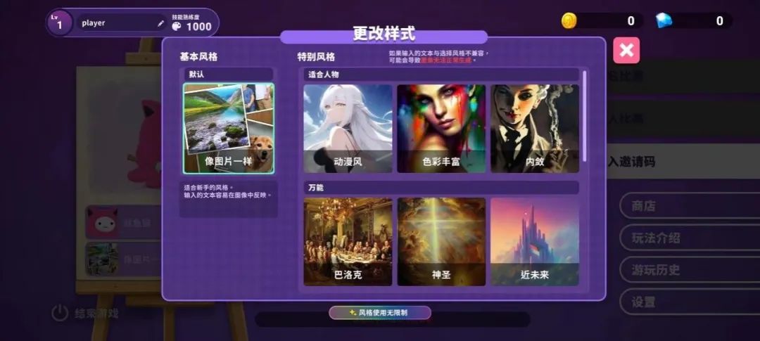 游戏中,提供了 14 种 AI 绘画的画风供玩家选择