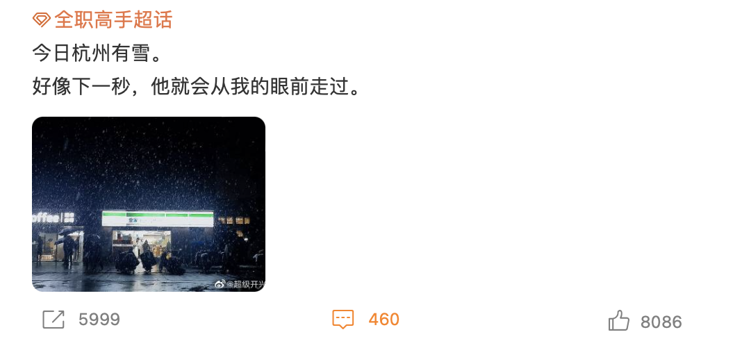 事实上,这场网络文字扮演已经持续了两天——粉丝根据小说的时间线推算,故事最开始叶修走出嘉世俱乐部的那个雪夜是2022年的12月2日,嘉世俱乐部所在的H市被认为原型是杭州,而当天地处南方的杭州市,已经下了快两天的初雪,被粉丝感慨地称为“世界线收束”。