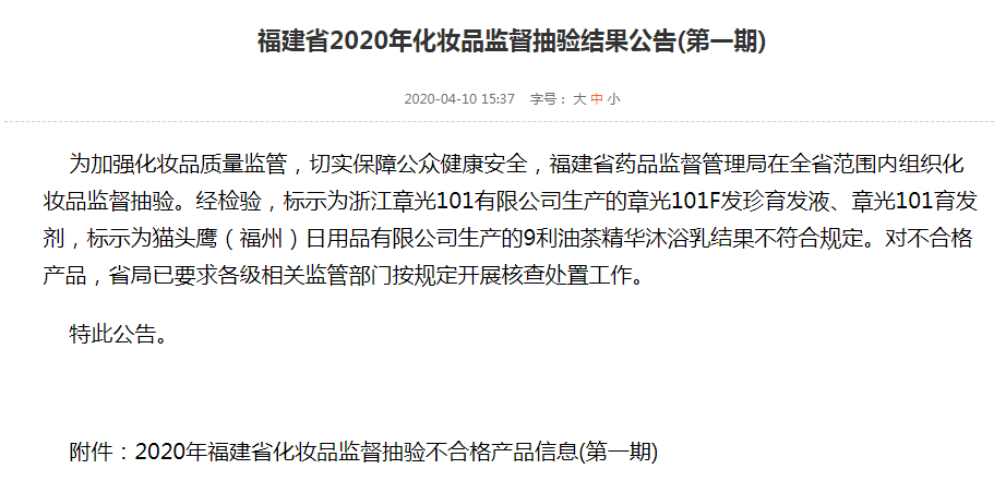 2020年,浙江章光101有限公司旗下两款章光101的育发产品(章光101F发珍育发液和章光101育发剂),也被检出含有违禁成分黄体酮,含量分别为0.024μg/g和0.026μg/g,,被福建省药品监督管理局通报。