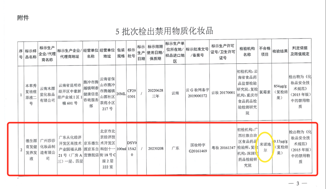 2021年1月28日,国家药监局发布《关于5批次化妆品检出禁用物质的通告》(2021年第9号)显示,生产企业/代理商名称为广州莎莎化妆品制造有限公司,产品名为德生源育发健发养发液(批次:DSY015A20)被检出禁用物质米诺地尔。