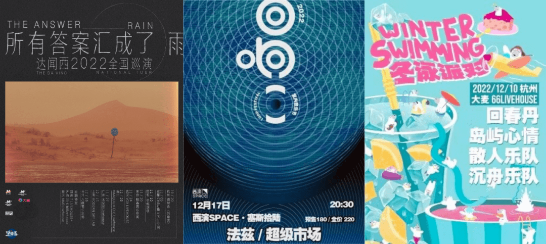 还有些乐队选择了小型的拼盘演出来“复工”,在《乐夏2》强势杀入20强的岛屿心情近日与国内高人气的散人乐队、回春丹等开启了两场演出,分别是10号在杭州进行的冬泳派对和11号在上海举办的跳水冠军演出。