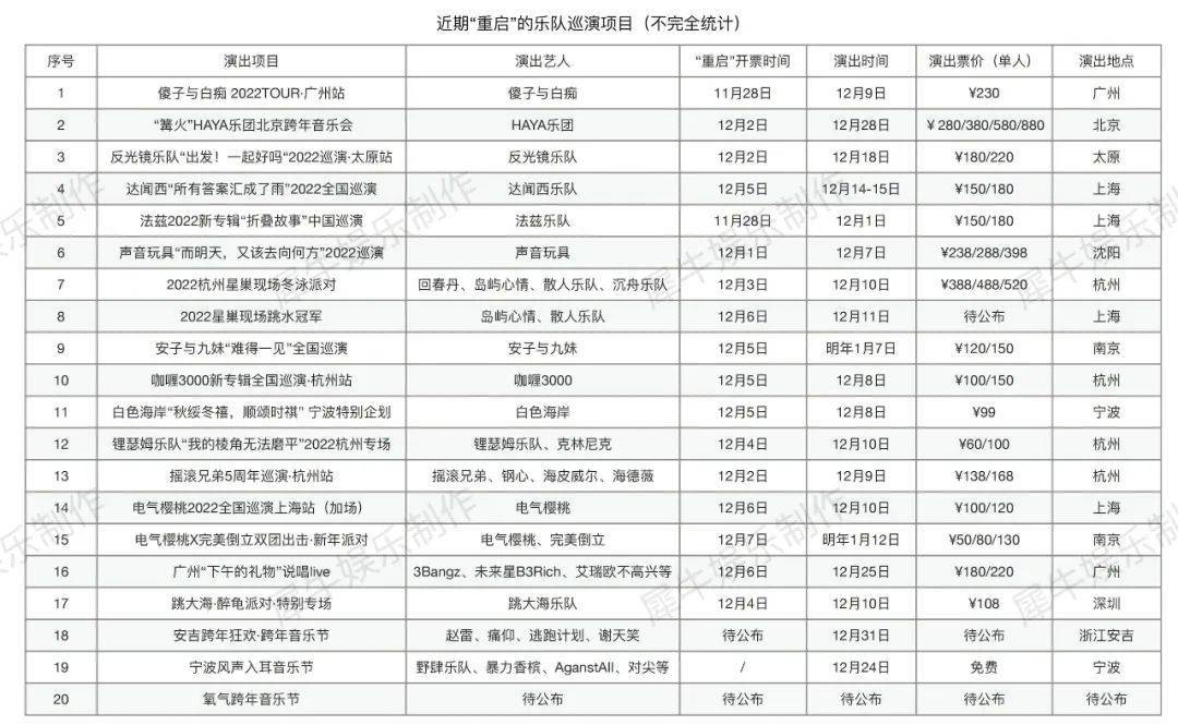 不过,目前大部分“复工”演出规模普遍偏小,巨星拼盘式音乐节、超大型的头部歌手演唱会仍不见踪影。但可以想见的是,随着近来各地防疫政策的大幅调整,我们可以期待更大型的演出项目相继与我们见面。