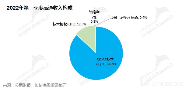 从公司最新的财报披露来看,高通的业务主要由 CDMA 技术(QCT 业务)和技术授权(QTL 业务)两部分构成,两业务合计占比达到 99% 左右。