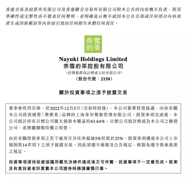 12月5日,奈雪的茶控股有限公司(以下简称“奈雪的茶”)发布公告称,已签署对乐乐茶主体公司上海茶田餐饮管理有限公司(以下简称“乐乐茶”)的投资协议。投资事项完成后,奈雪的茶将持有目标公司43.64%股本权益,即奈雪的茶将成为乐乐茶的第一大股东。