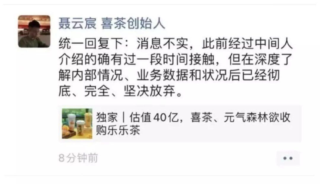但结果不仅不圆满,而且最后场面还不太好看。广为行业人士所知的是,面对彼时的外界传闻,喜茶创始人聂云宸在自己的朋友圈里公开否认收购乐乐茶:“消息不实,此前经过中间人介绍的确有过一段时间接触,但在深度了解内部情况、业务数据和状况后已经彻底、完全、坚决放弃。”