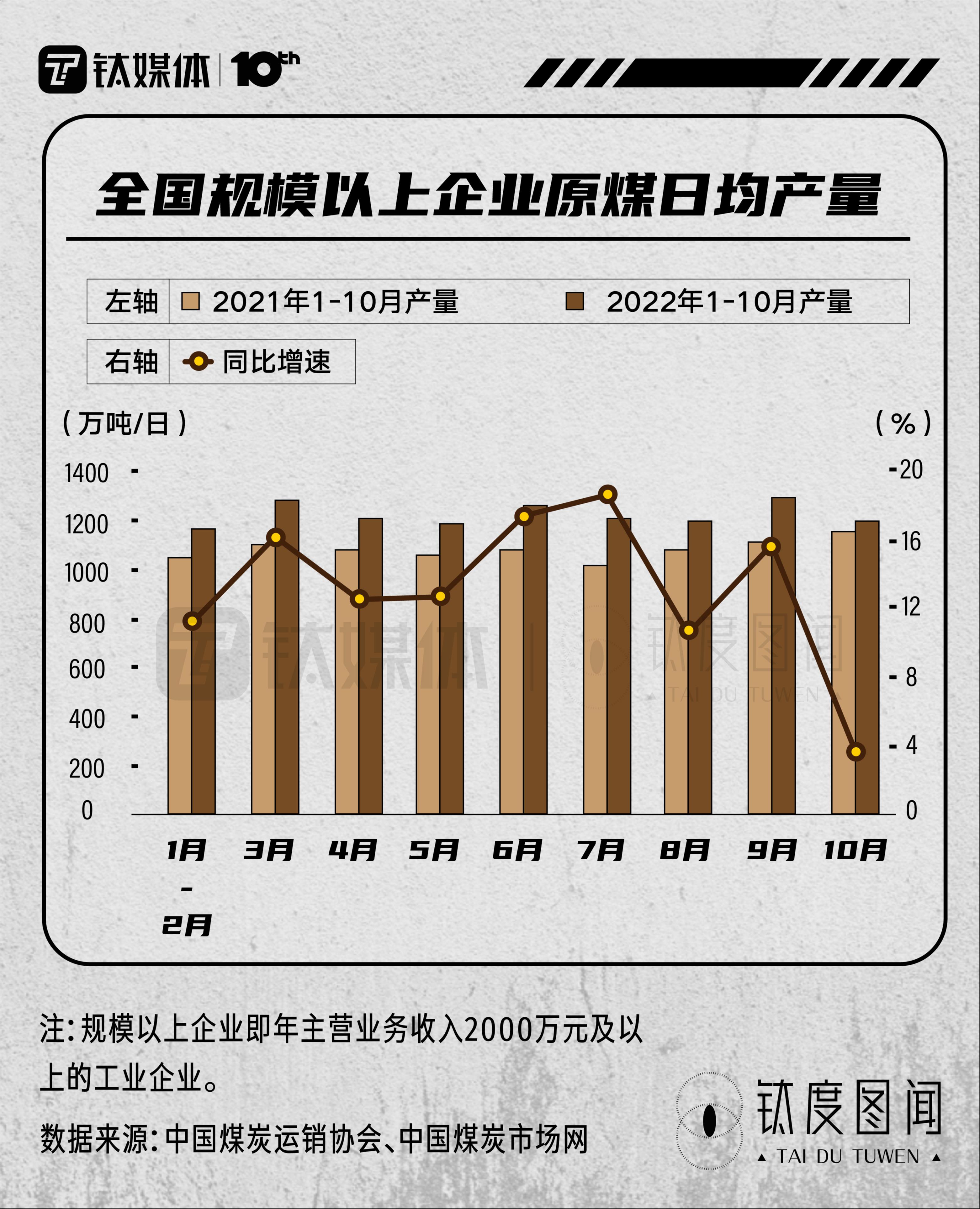 今年以来,受益于保供政策,原煤产量稳定增长。2021年,全国原煤产量41.26亿吨,同比增长5.7%,创历史新高;2022年1-10月份全国煤炭累计产量36.85亿吨,较去年同期增长11.8%。