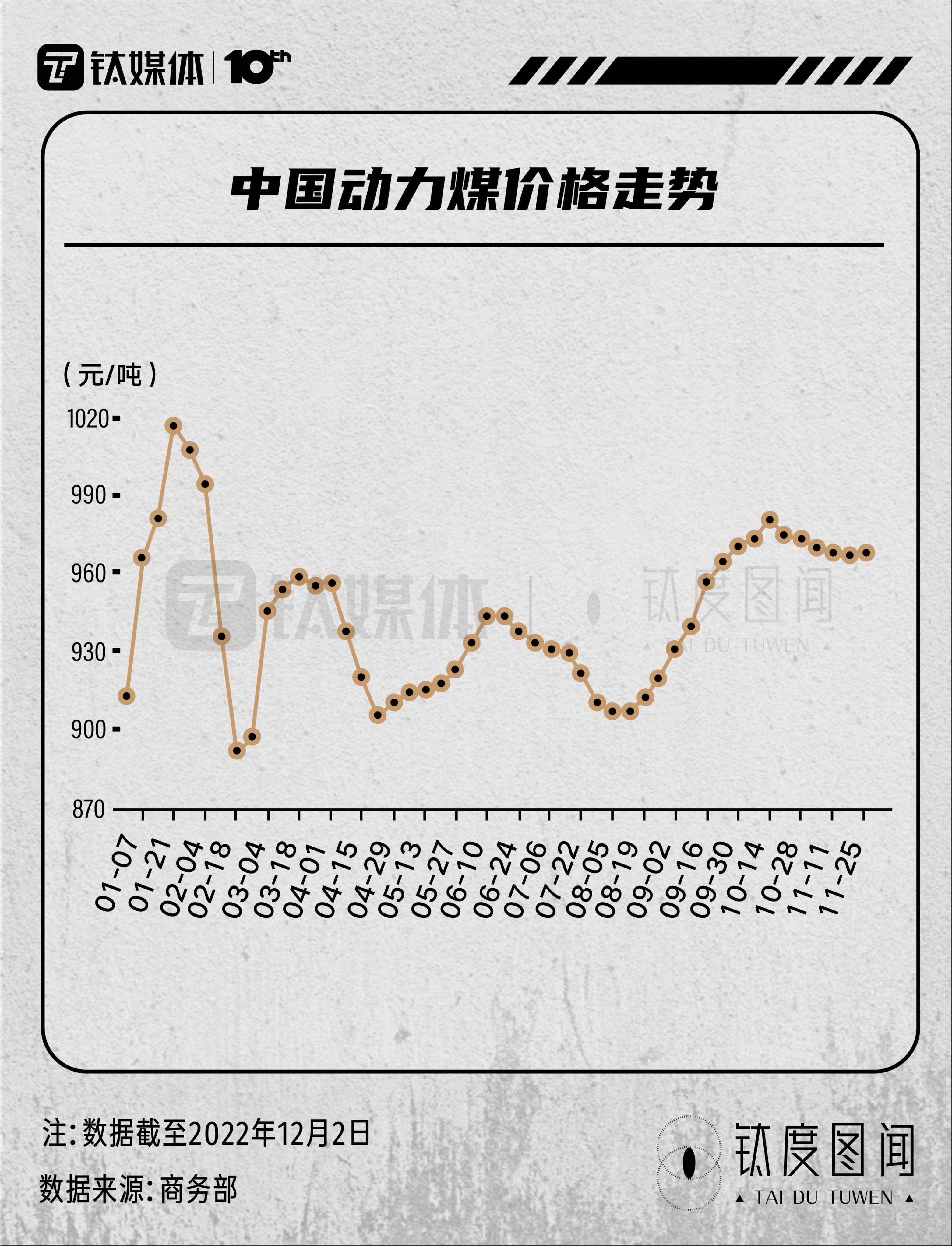 进入12月,在寒潮天气的影响下,北方气温快速下降使得煤炭需求出现阶段性改善,煤炭价格迎来看涨预期,国内动力煤价格止跌小幅反弹,截至2022年12月2日,动力煤价格达968元/吨,环比上涨0.1%。