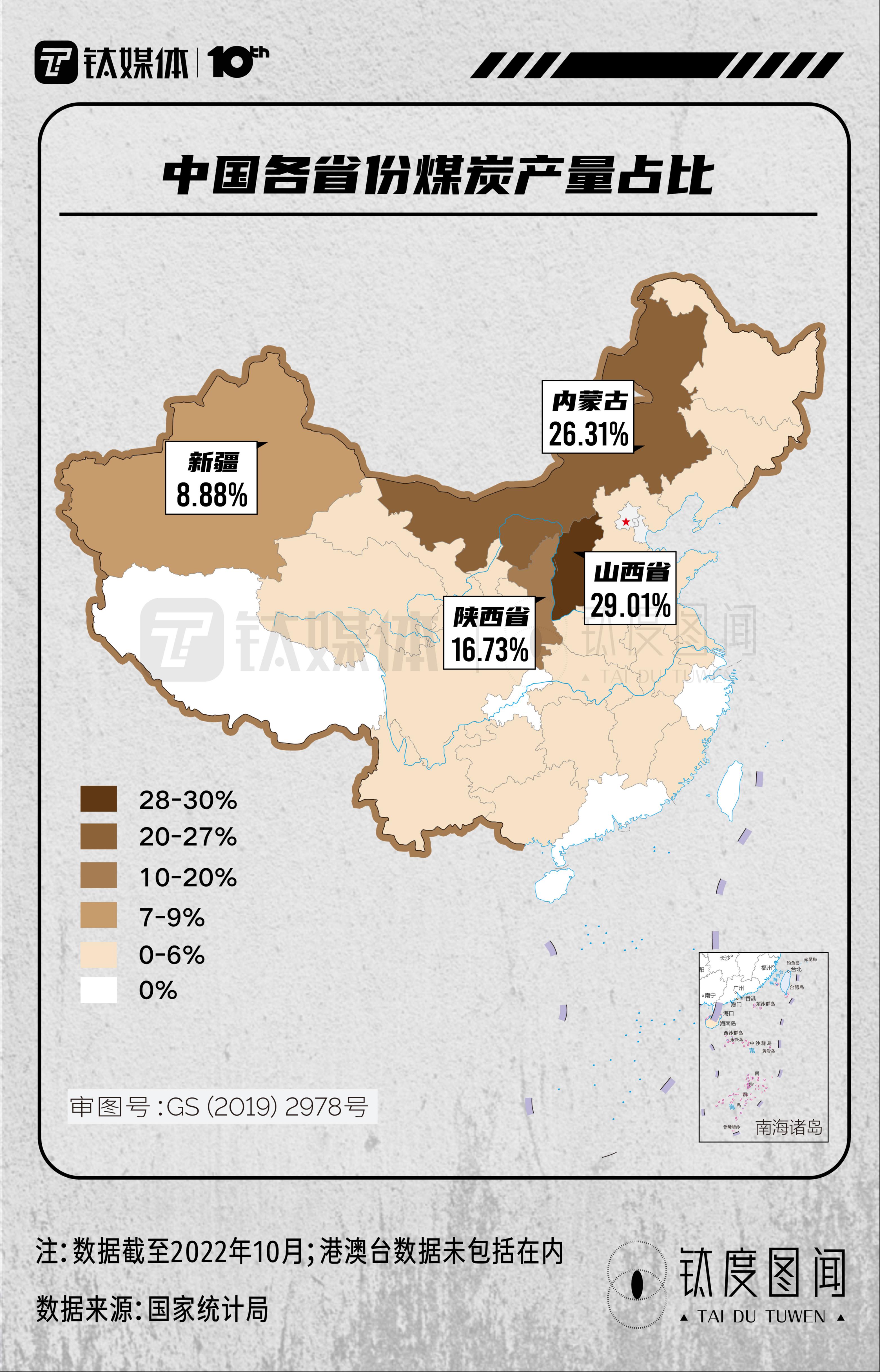 哪些省份是产煤主力?从地理上看,煤炭产区的集中更加明显。山西、内蒙古、陕西是中国三个产煤大省,截至2022年10月,其产量分别为10.7亿吨、9.7亿吨、6.2亿吨,占比分别为29.01%、26.31%和16.73%,这三大省份的产煤量占产煤总量的72%。