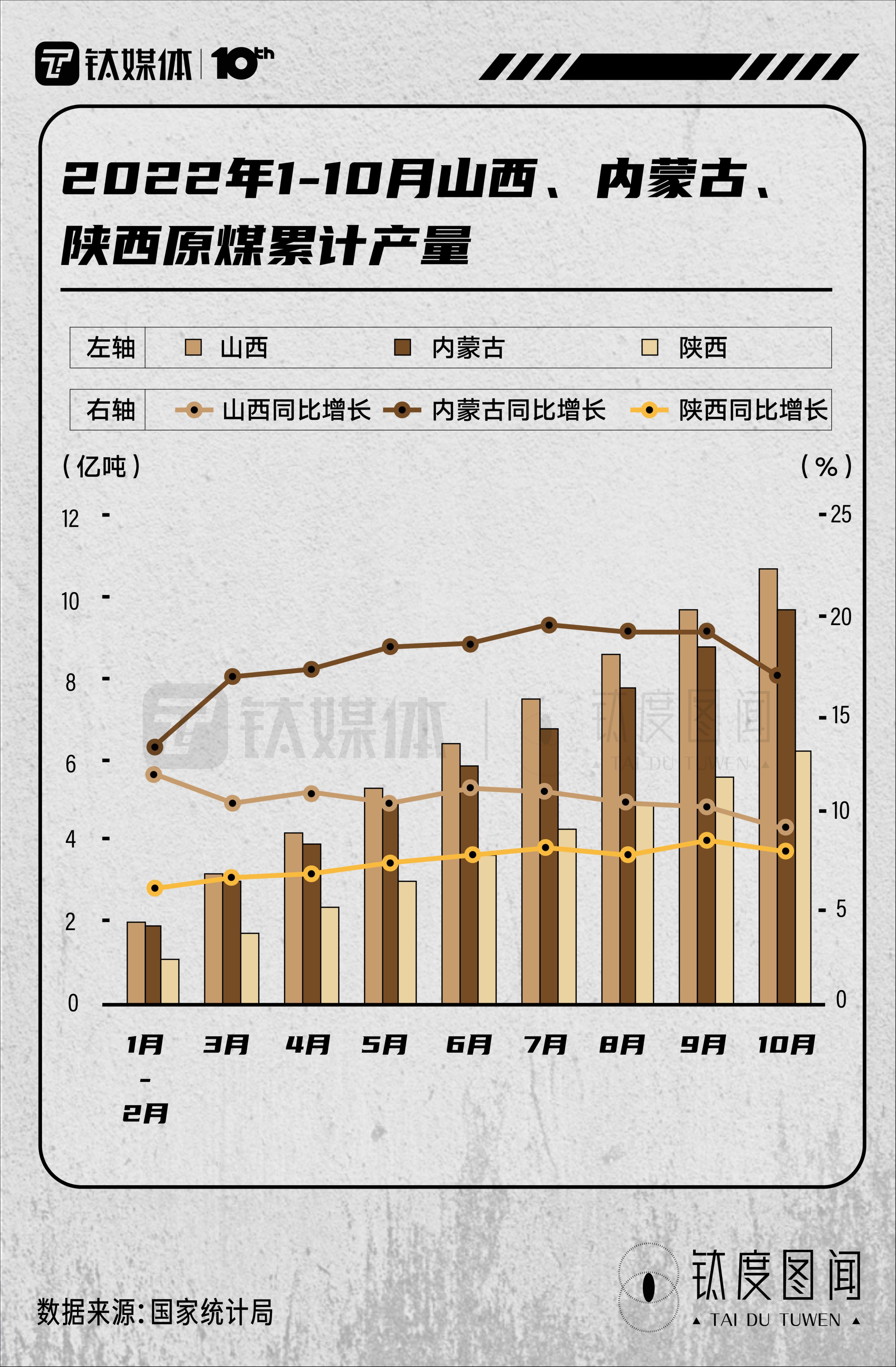 具体来看,2022年前10个月,山西、内蒙、陕西三个产煤大省单月原煤累计产量均大幅提升,涨幅均超5倍之多。其中,内蒙古自治区原煤产量同比增幅最大,达16.51%,山西省和陕西省原煤产量同比增幅分别为8.85%和7.75%,三省有序推动煤炭产能释放。