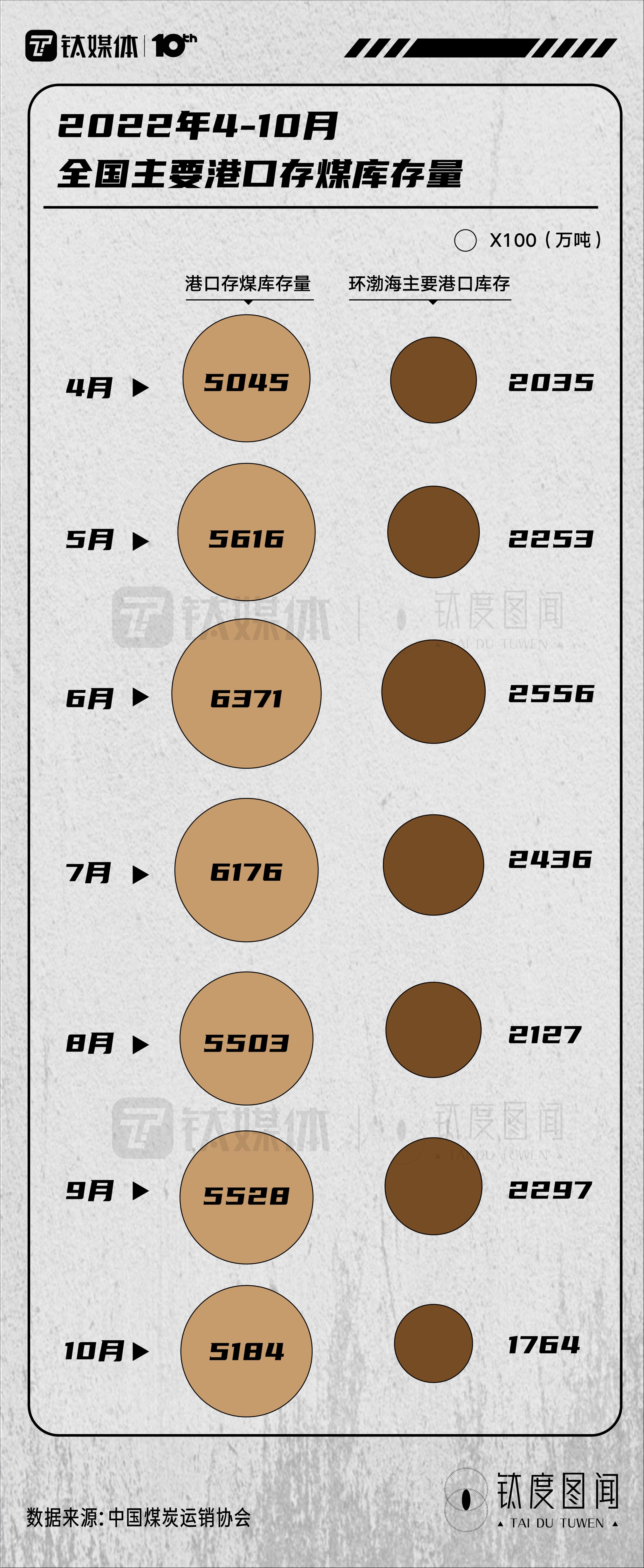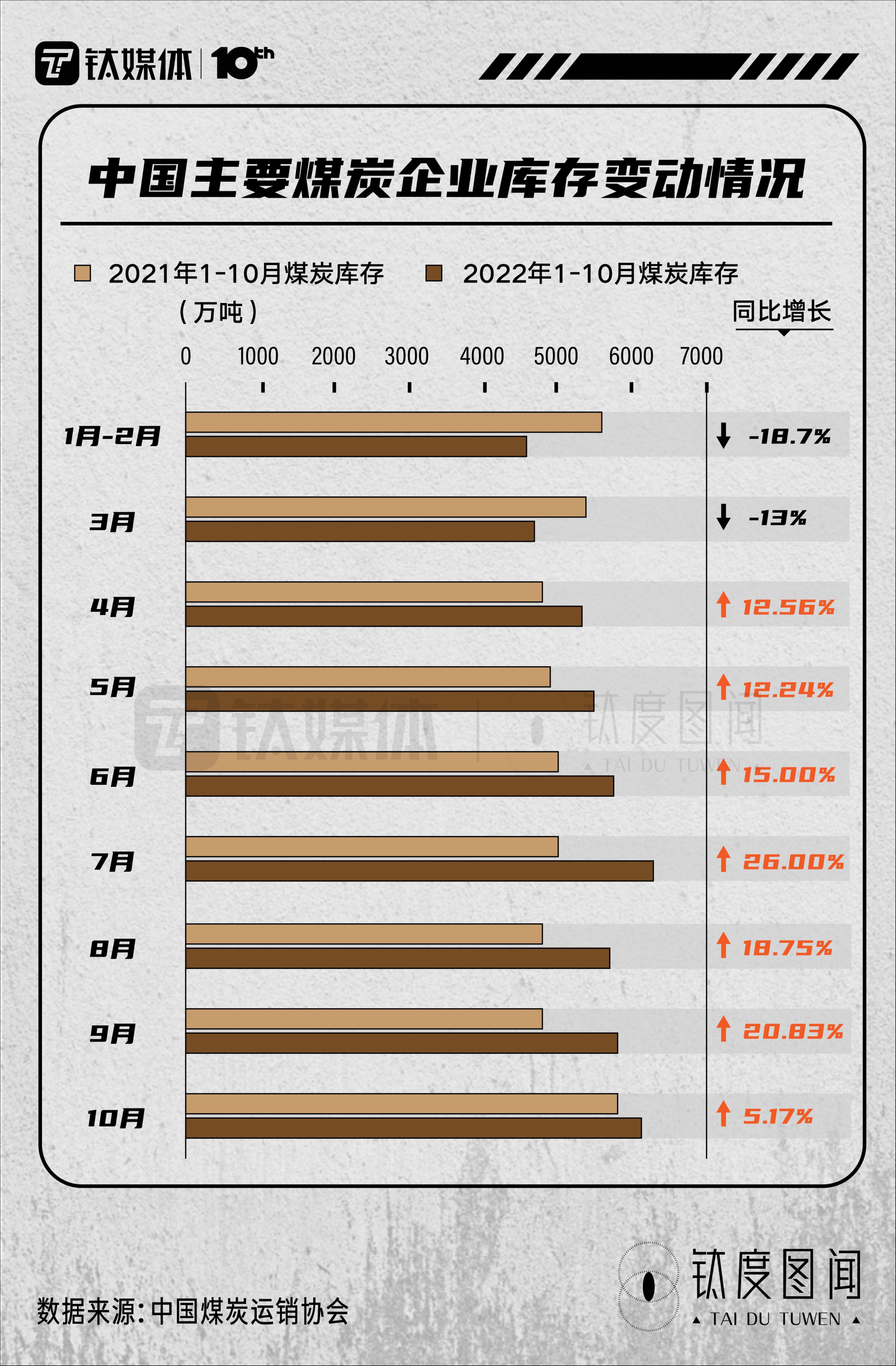 今年以来,全国主要煤炭企业库存持续升高,截至2022年10月末,全国煤炭企业存煤6100万吨,较年初增长34%,较去年同期增长5.17%,存煤水平较高。