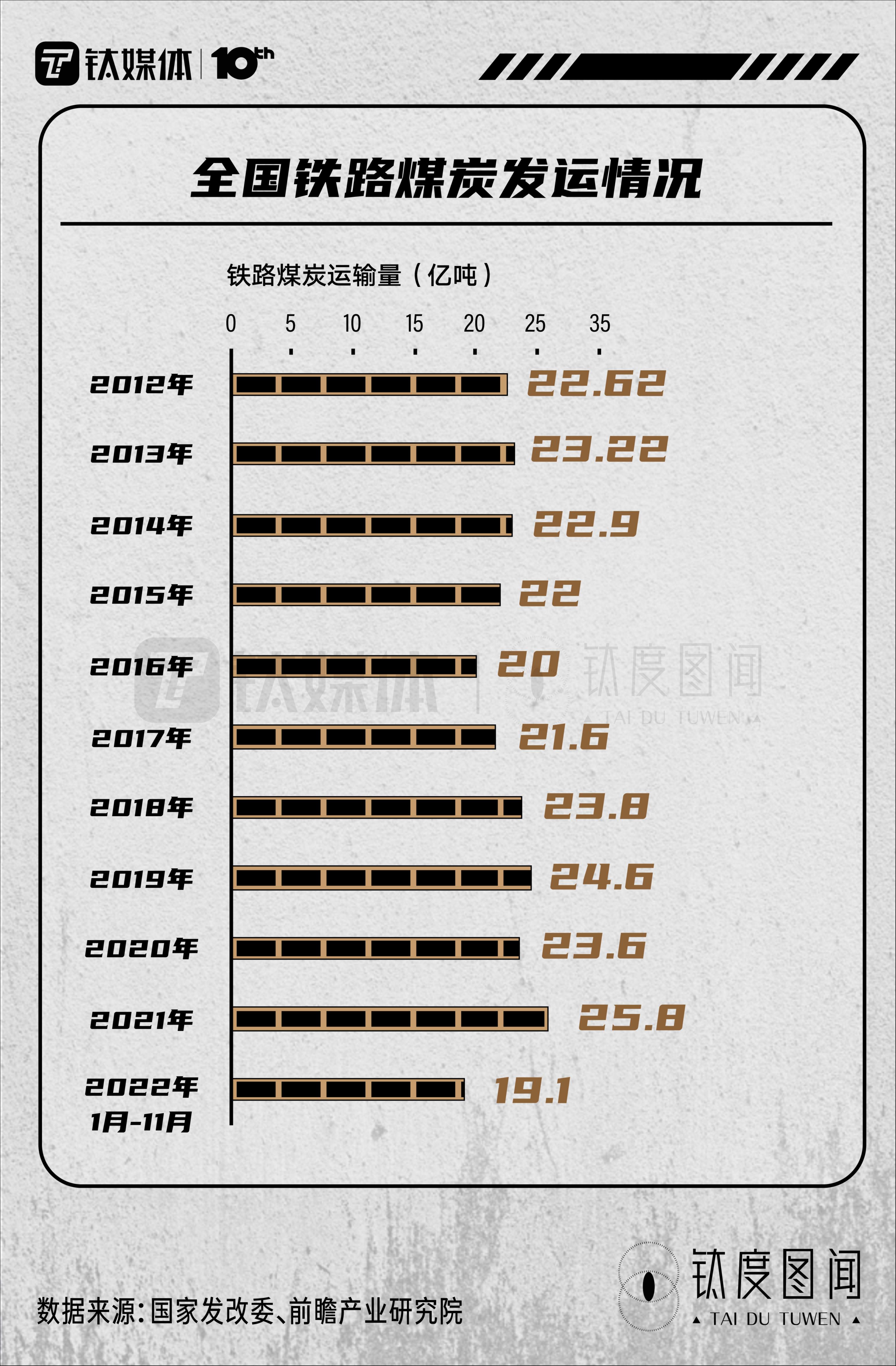 近年来,中国煤炭转运能力逐渐提高,2021年达到25.8亿吨的历史高位。2022年前11个月,国家铁路完成煤炭运量19.1亿吨,同比增加1.43亿吨、增长8.1%,其中电煤运量13.5亿吨,同比增加1.6亿吨、增长13.2%。煤炭和电煤装车数均创历史最好水平。