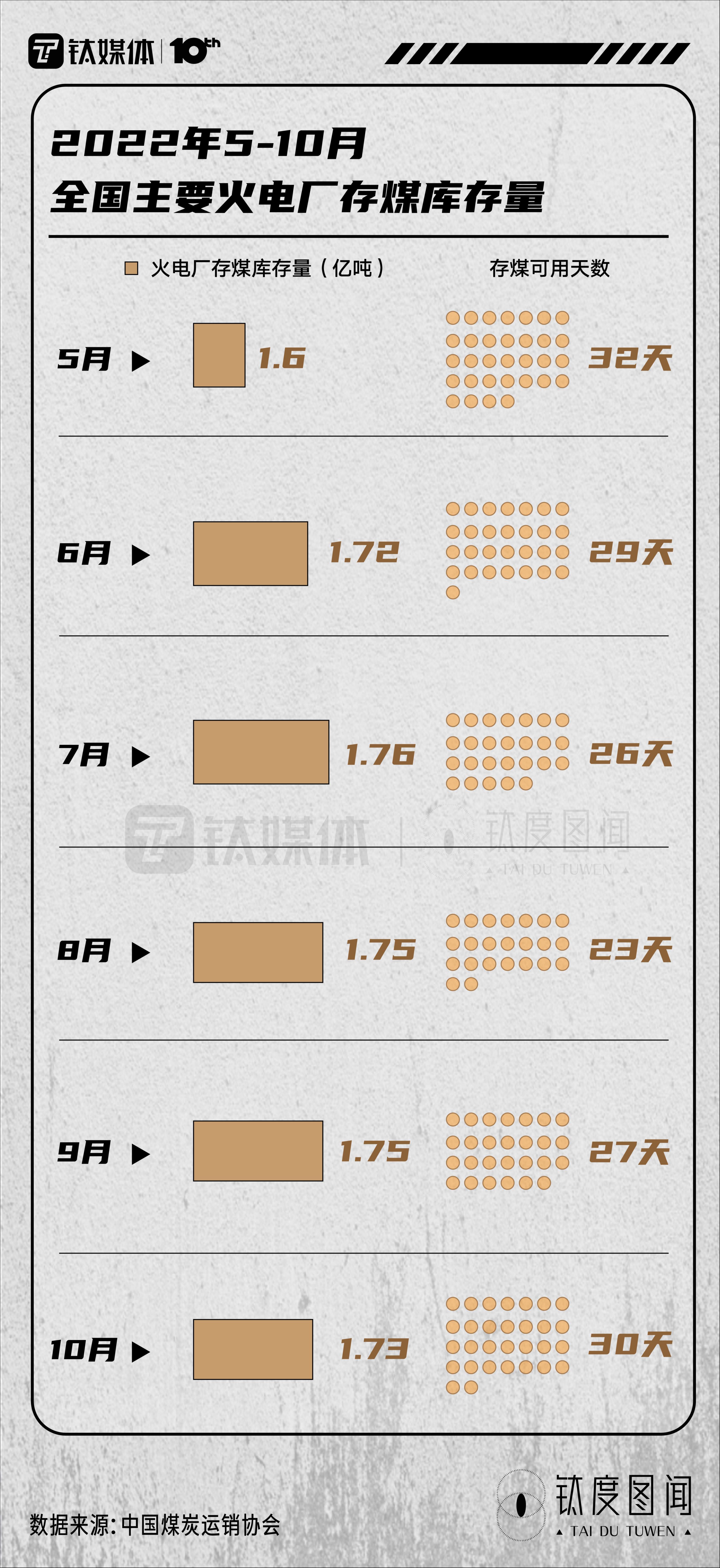 随着南方地区气温逐渐减弱,电煤供应量同样受到关注。6月以来,全国主要火电厂存煤保持在1.7亿吨以上。10月末,全国主要火电厂存煤1.73亿吨,同比增加约6500万吨、增长60%,持续保持历史高位,存煤可用约30天。电煤供应形势持续向好,有效保障了发电供热用煤需求。