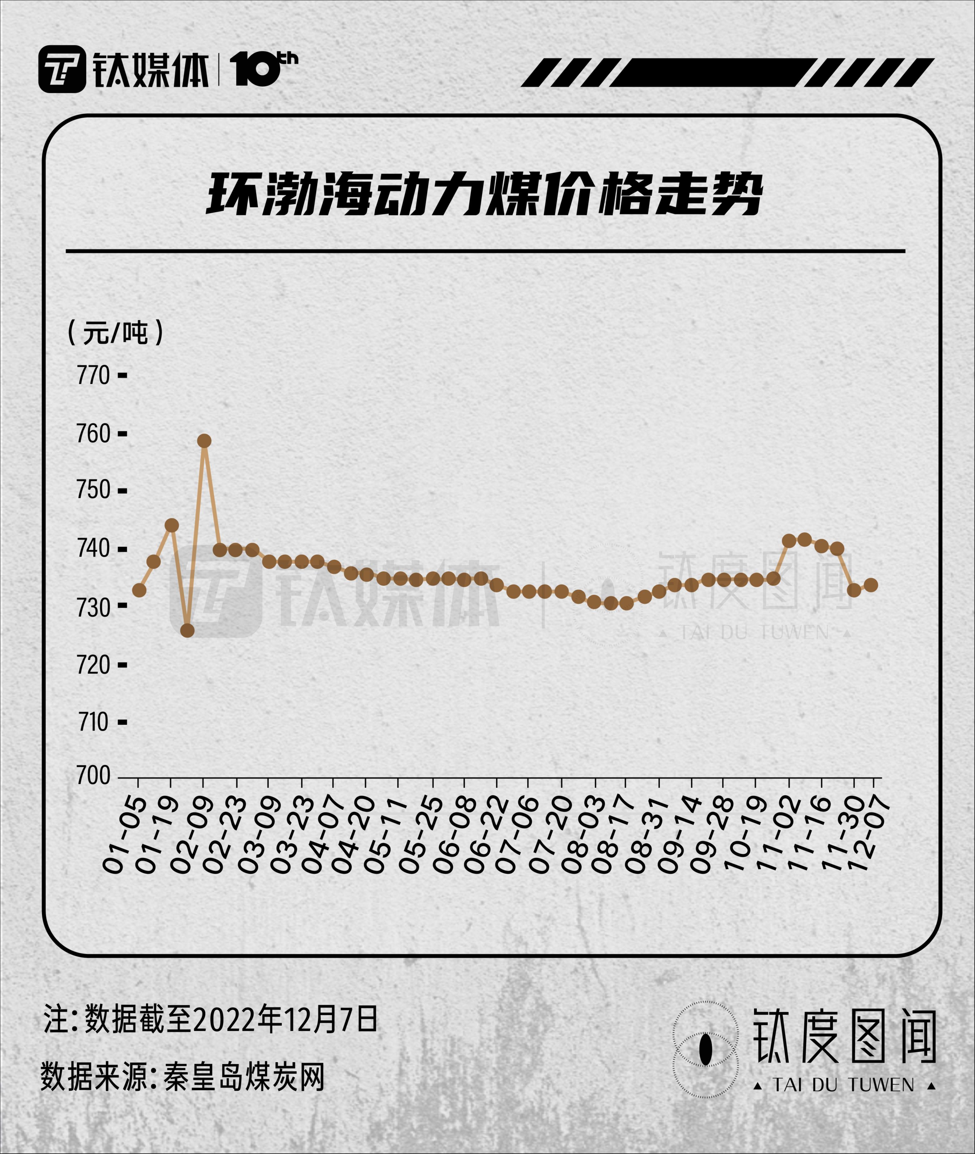 环渤海港口是重要的煤炭转运集散地,其价格是煤炭市场价格的“风向标”。 12月7日,最新一期环渤海动力煤价格指数同样止跌反弹,报收于734元/吨,环比上涨0.14%。截至12月2日,秦港5500大卡动力煤市场价1350元/吨,环比增长5.47%。