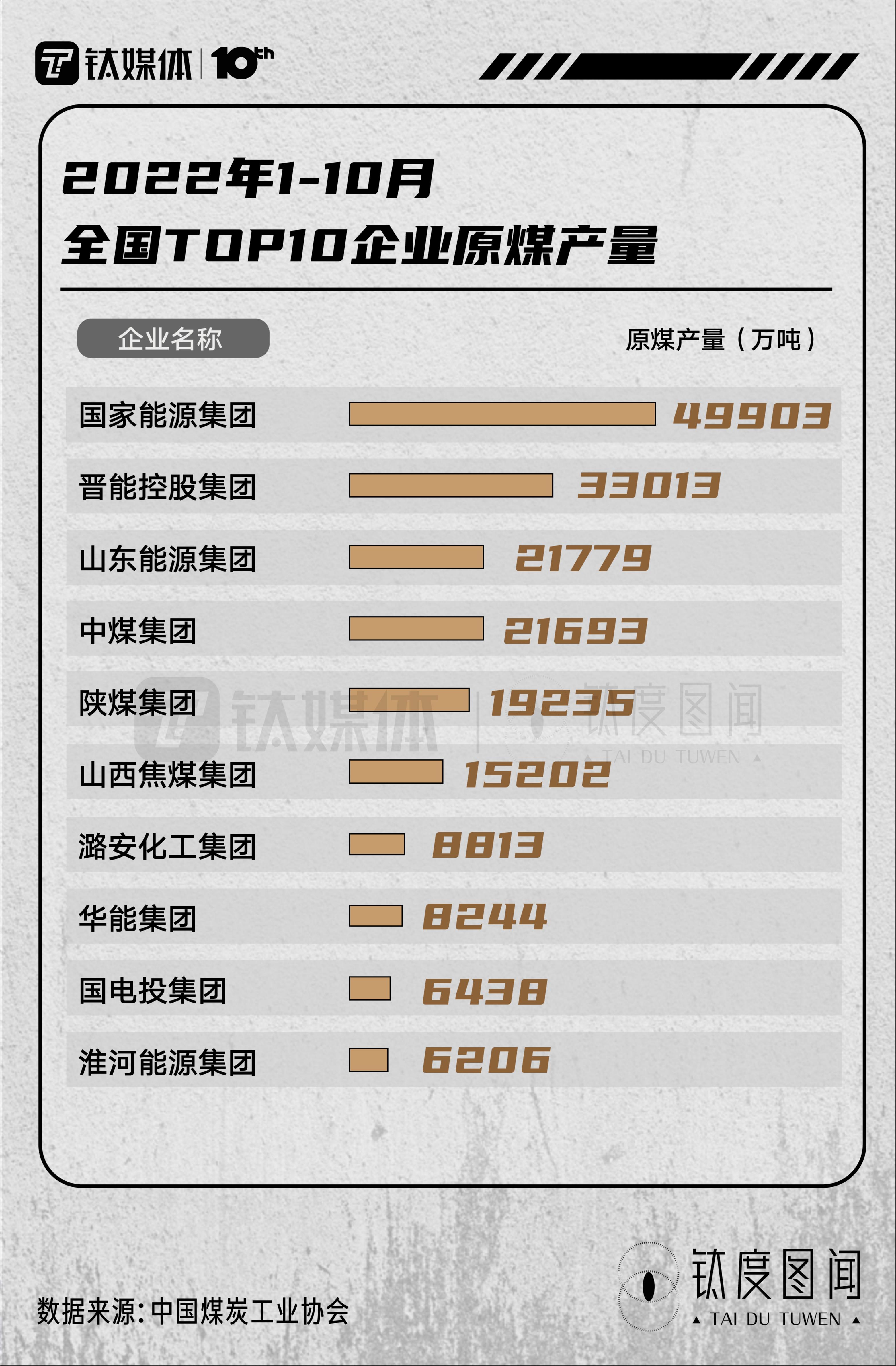 据统计,全国排名前10家企业原煤产量合计为19.1亿吨,同比增加1.2亿吨,占规模以上企业原煤产量的51.8%。其中,国家能源集团前10个月原煤产量最多,达49903万吨,同比增长6.9%;其次是晋能控股集团,原煤产量为33013万吨,同比增长4.4%。