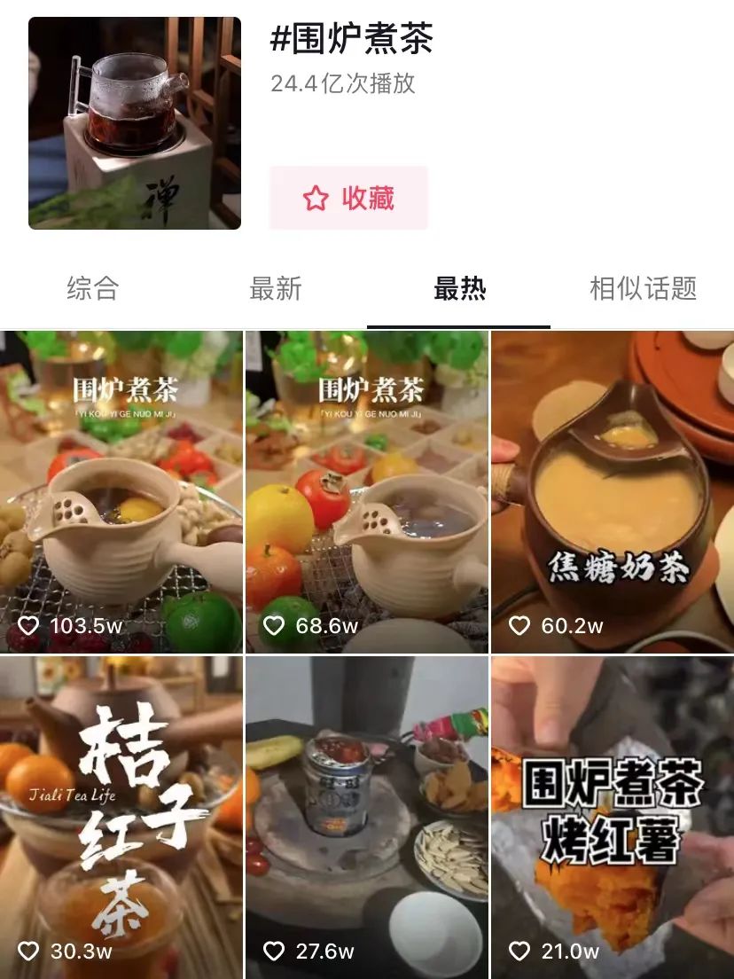 截至撰稿时,抖音上#围炉煮茶#相关话题播放量已经超过24亿次,其中,最火的一则视频点赞破百万,而小红书上,“围炉煮茶”相关话题也有高达1158万次的浏览量。