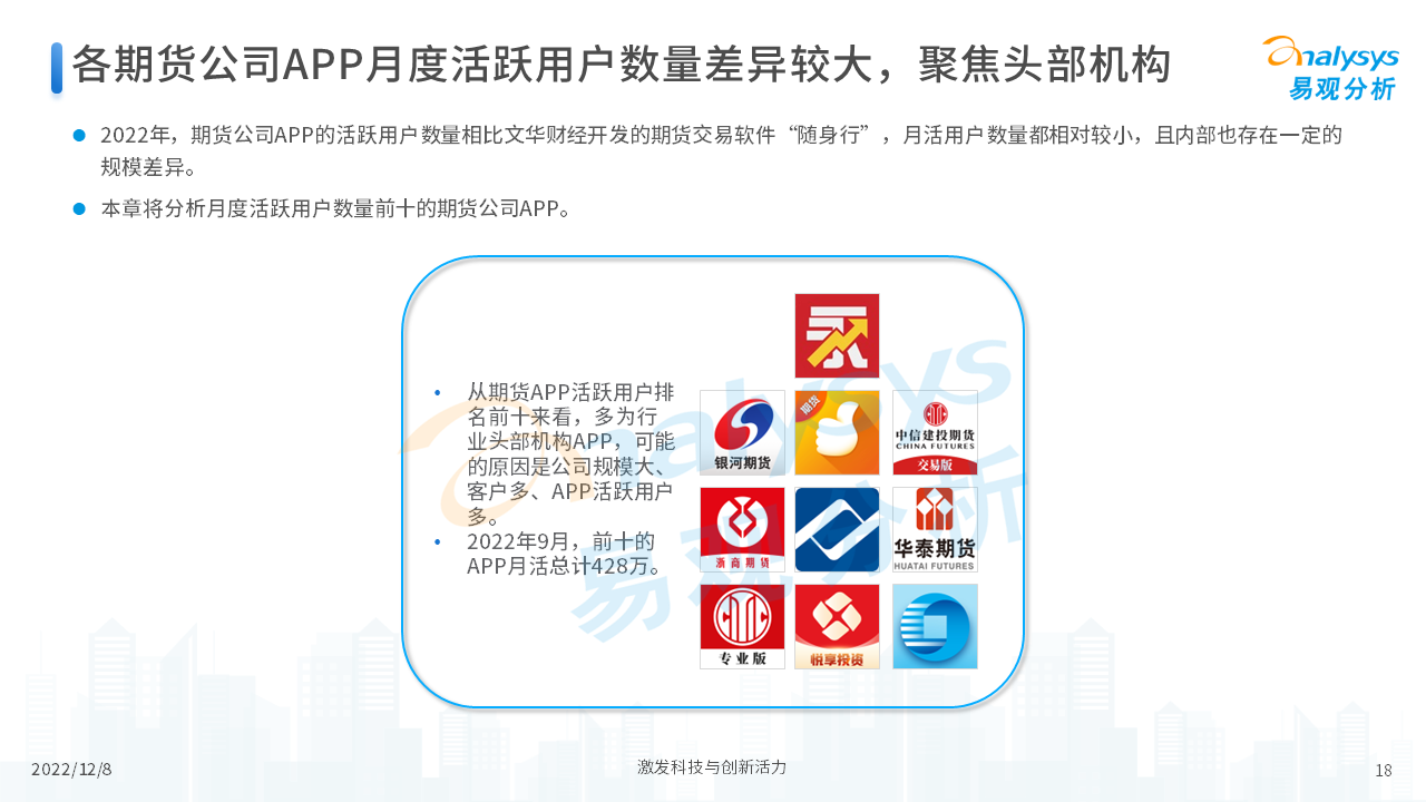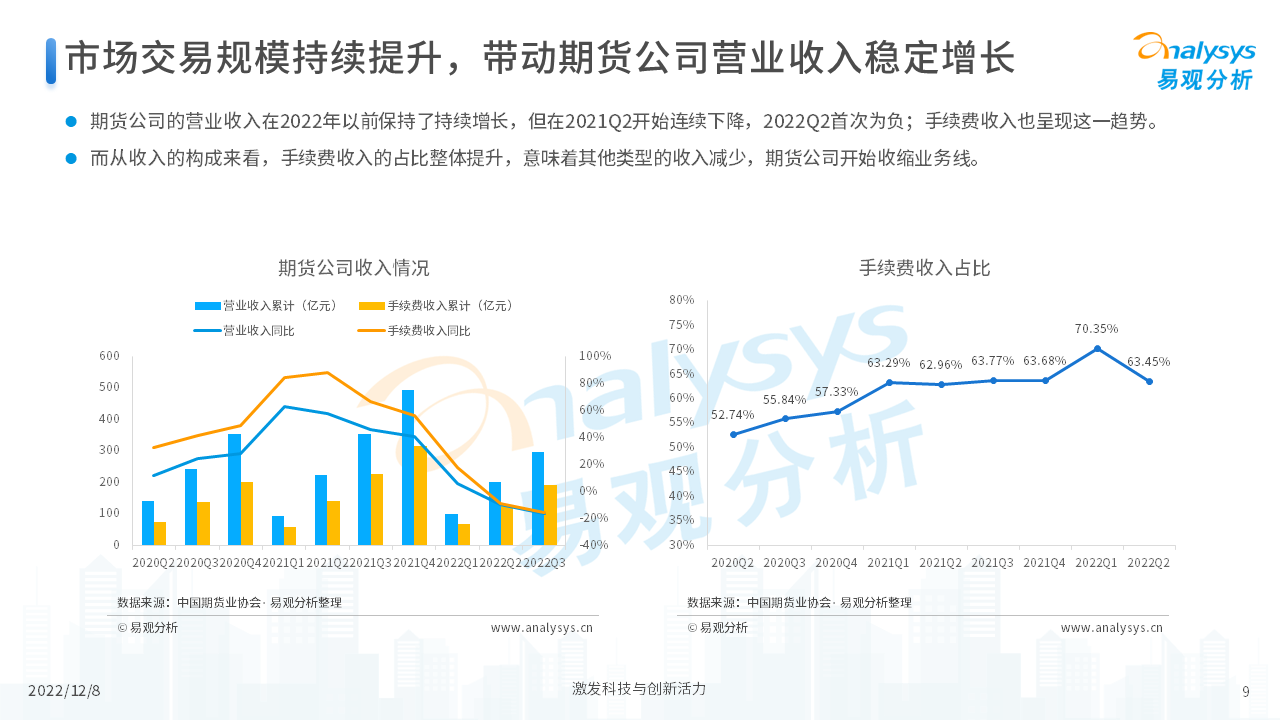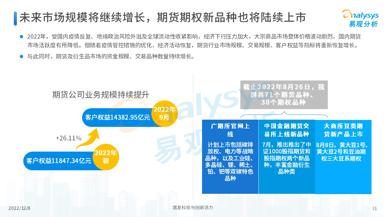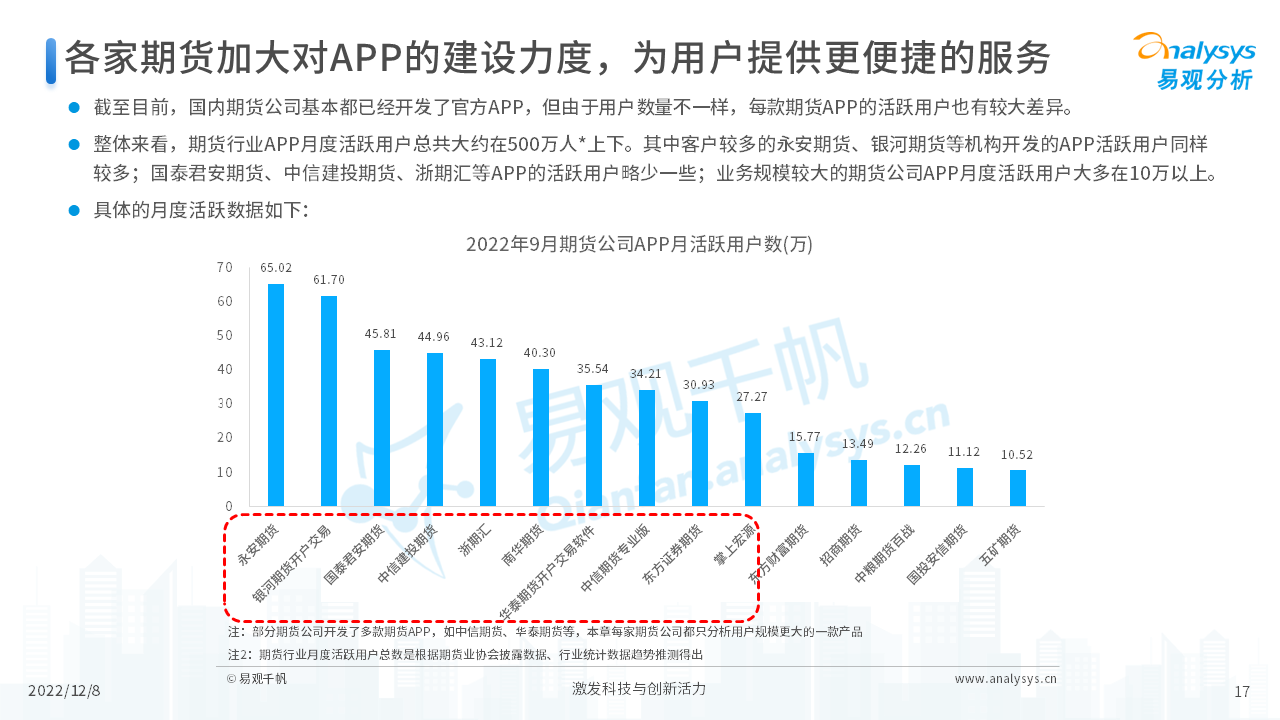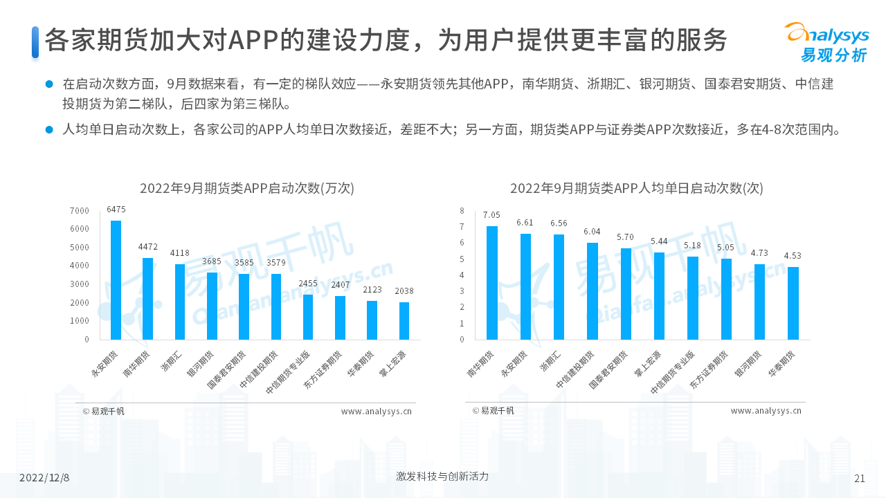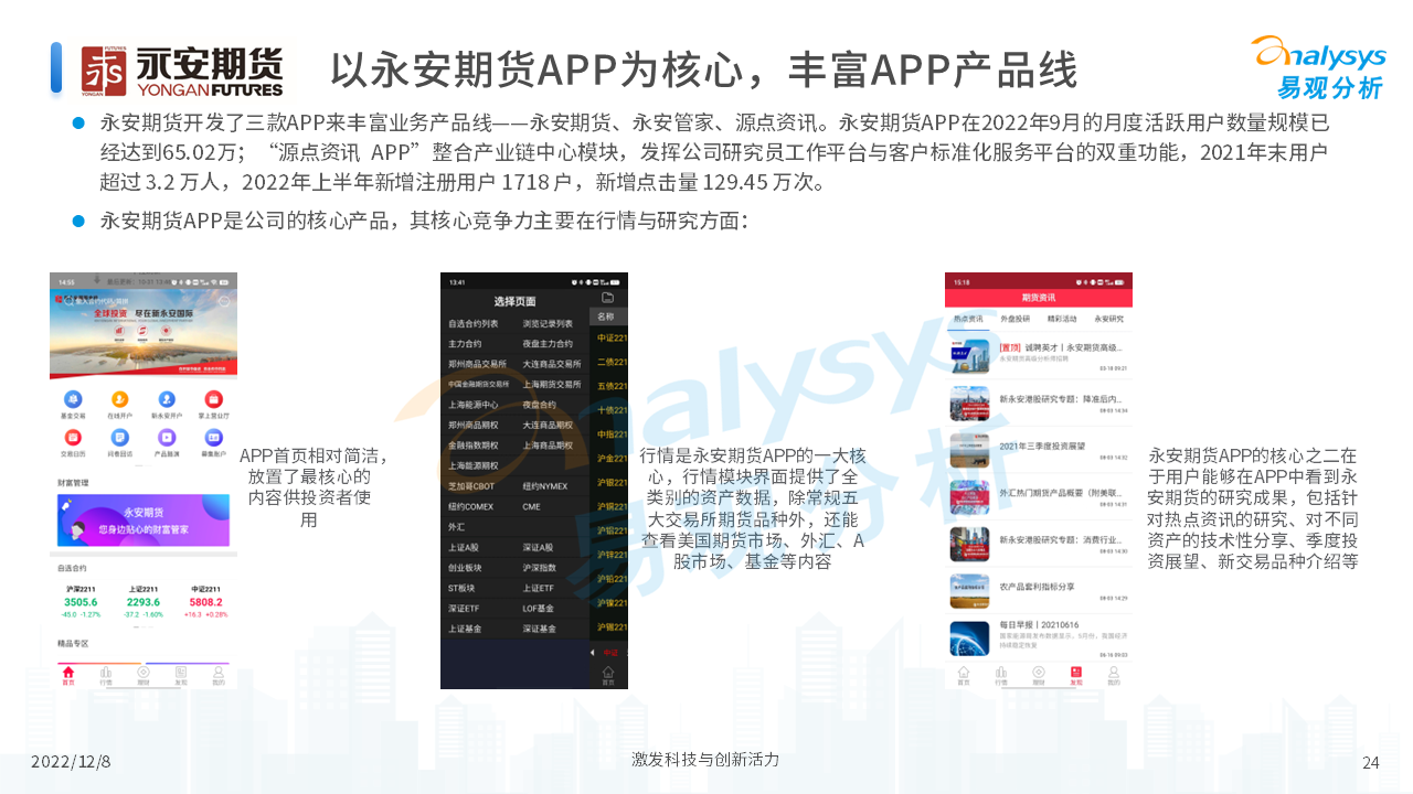 报告从期货行业发展概况、发展特征、期货公司科技化转型,以及行业未来发展趋势等四个维度,对当前期货行业进行了分析。我们认为,在传统网店营业模式的基础上,更多的期货公司会通过APP的形式来拓展业务,让服务更贴近客户、让营销更有的放矢。