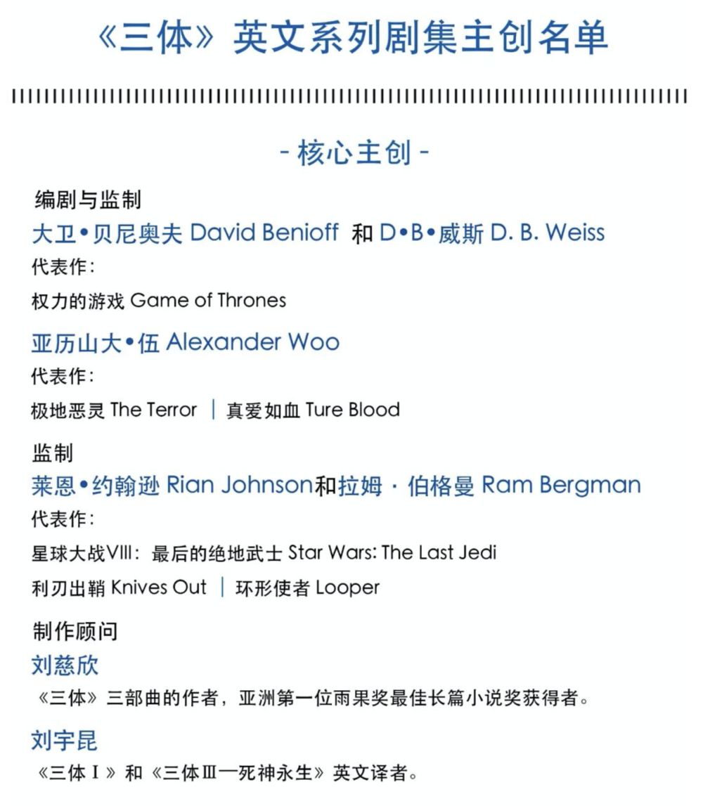 在官宣名单中,观众能想象到的最豪华剧集配置,都在《三体》里了。甚至,为了“确保对原著精神进⾏忠实、准确地表达”,奈飞版《三体》将刘慈欣、英文版翻译刘宇昆,以制作顾问的身份,拉进核心主创名单。