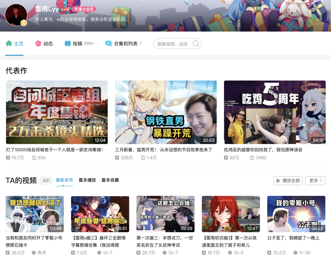 B站主播雷雨Lyy从前就是一个绝地求生主播,尽管已经算分区头部,但粉丝数量也就只有接近十万左右。误打误撞之下开始直播原神,通过几次爆火的视频切片带来了人气的飙升,目前已经超百万粉丝。