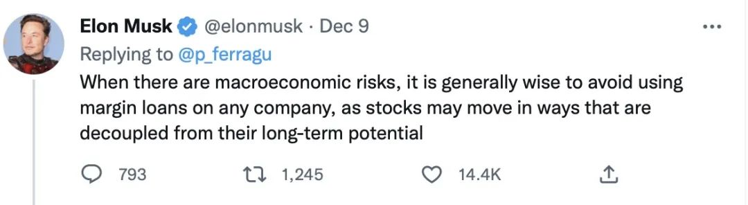 Pierre Ferragu的推文收获了马斯克本人的回应,他说:当有宏观经济风险时,一般来说,避免对任何公司使用保证金贷款是明智的,因为股票可能以和公司长期潜力脱钩的方式移动。