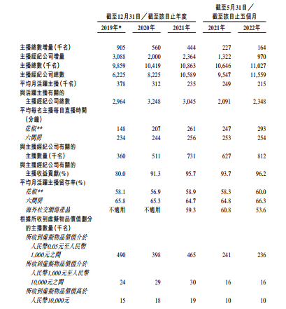 平均月活主播下降明显,月活主播留存率低。招股书显示,2019年、2020年、 2021年及截至2022年5月31日五个月,主播总数增量分别为90.5万人、56万人、44.4万人、16.4万人,增速下滑明显,平均月活主播分别为37.8万人、31.2万人、23.5万人、21.5万人,下滑明显,花椒的平均月活主播留存率保持至58-59%,六间房该数据优于花椒,保持在64-66%之间。