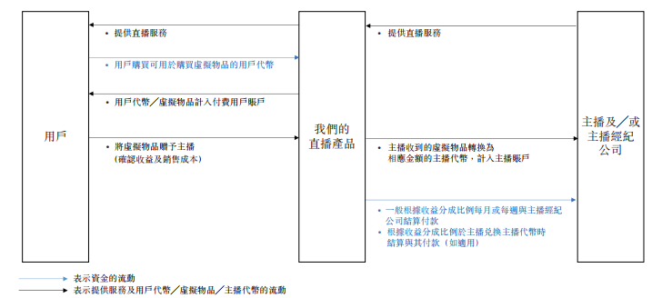 直播业务收入主要来自用户的打赏。根据招股书显示,对于主播收到的虚拟物品产生的收益,花房集团与主播及其相关主播经纪公司进行分成。各虚拟物品相当于若干金额的主播代币,有关代币可按预先厘定的比例兑换为现金。当主播收到虚拟物品时,平台会自动将虚拟物品转换为相应金额的主播代币,主播代币将计入主播的账户,并可根据平台、主播及其相关主播经纪公司之间的收益分成安排兑换为人民币。