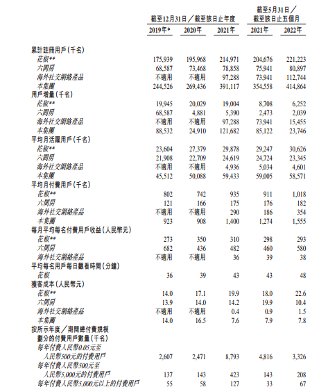花椒平台用户增长乏力,付费意愿降低,获客成本越来越高。2019年、2020年、 2021年及截至2022年5月31日五个月,花椒平台累计用户数分别为1.76亿人、1.96亿人、2.15亿人、2.21亿人,分别新增1945万人、2003万人、1900万人、625万人,增速呈下滑趋势,平均月活用户数分别为2360万人、2738万人、2988万人、3063万人,平均付费用户80.2万人、74.2万人、93.5万人、101.8万人,平均每名付费用户收益分别为273元、350元、310元、293元,整体呈下滑趋势。获客成本分别为14元、17.1元、19.9元、22.6元。