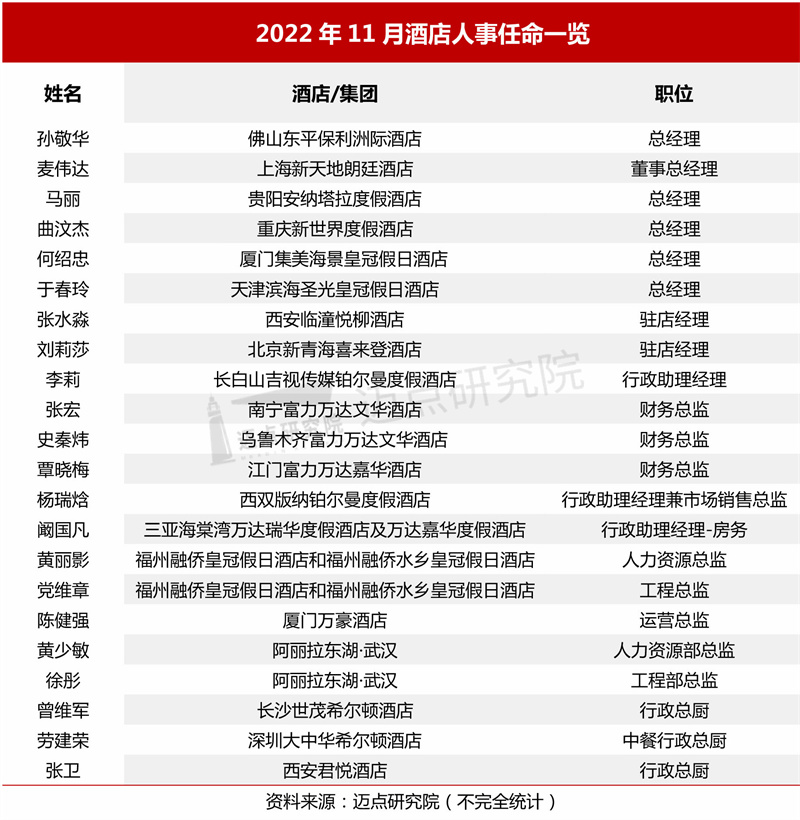 酒店人事任命:据迈点不完全统计,2022年11月共有22位高管履新,其中涉及万豪、希尔顿、洲际、喜来登、皇冠假日、阿丽拉、铂尔曼、万达文华等数十个高端酒店品牌。酒店各职务人才的变动和优化,将助于提升酒店品质、提高协作效能。