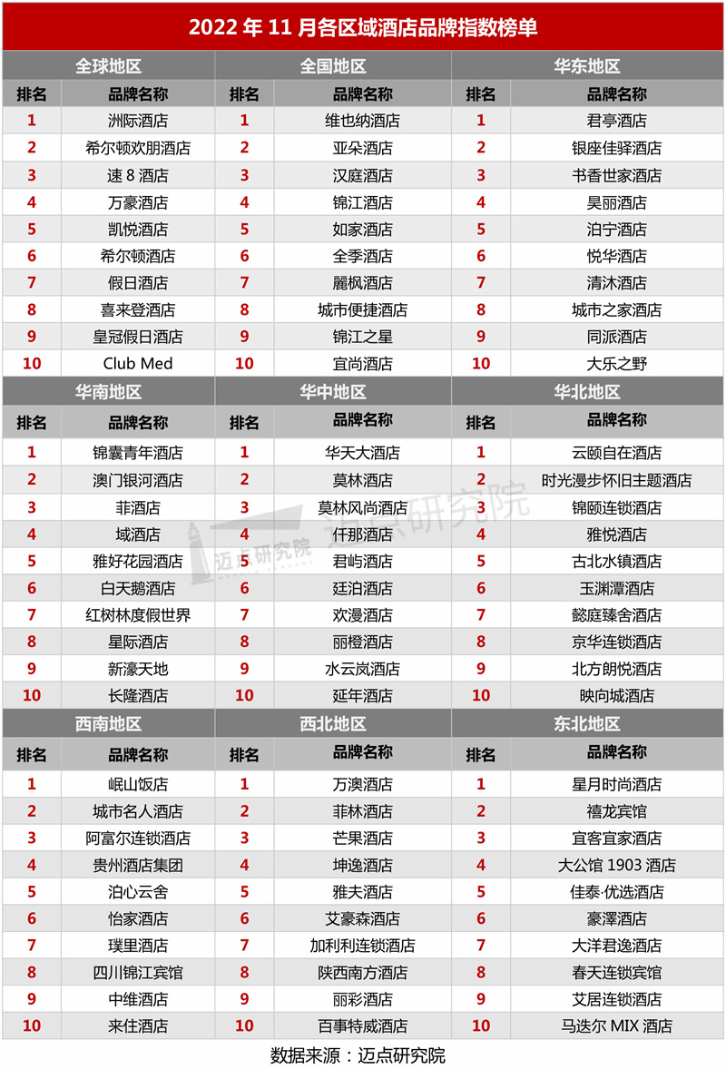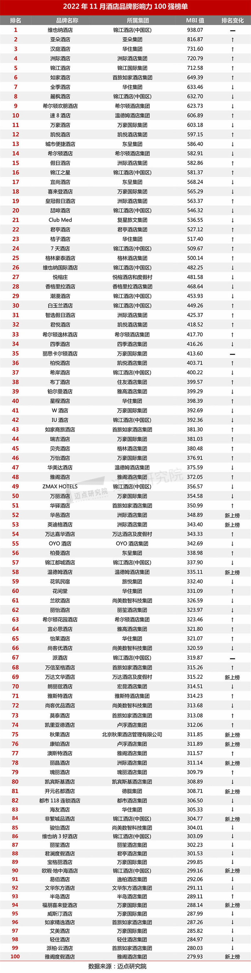 以下是迈点研究院独家发布的“2022年11月酒店品牌影响力100强榜单”。 本月, 维也纳酒店、亚朵酒店和汉庭酒店位列前三,另有洲际酒店、锦江酒店、如家酒店、全季酒店、麓枫酒店、希尔顿欢朋酒店和速8酒店进入榜单前十。本月100强榜单中,共有40个品牌排名环比上升,45个品牌排名环比下降,3个品牌排名没有发生变化。本月共有12个酒店品牌新晋百强榜单,分别为:华邑酒店、英迪格酒店、温德姆酒店、万达文华酒店、秋果酒店、康铂酒店、丽晶酒店、开元名都酒店、非繁城品酒店、欧暇·地中海酒店、福朋喜来登酒店和雅阁度假酒店。