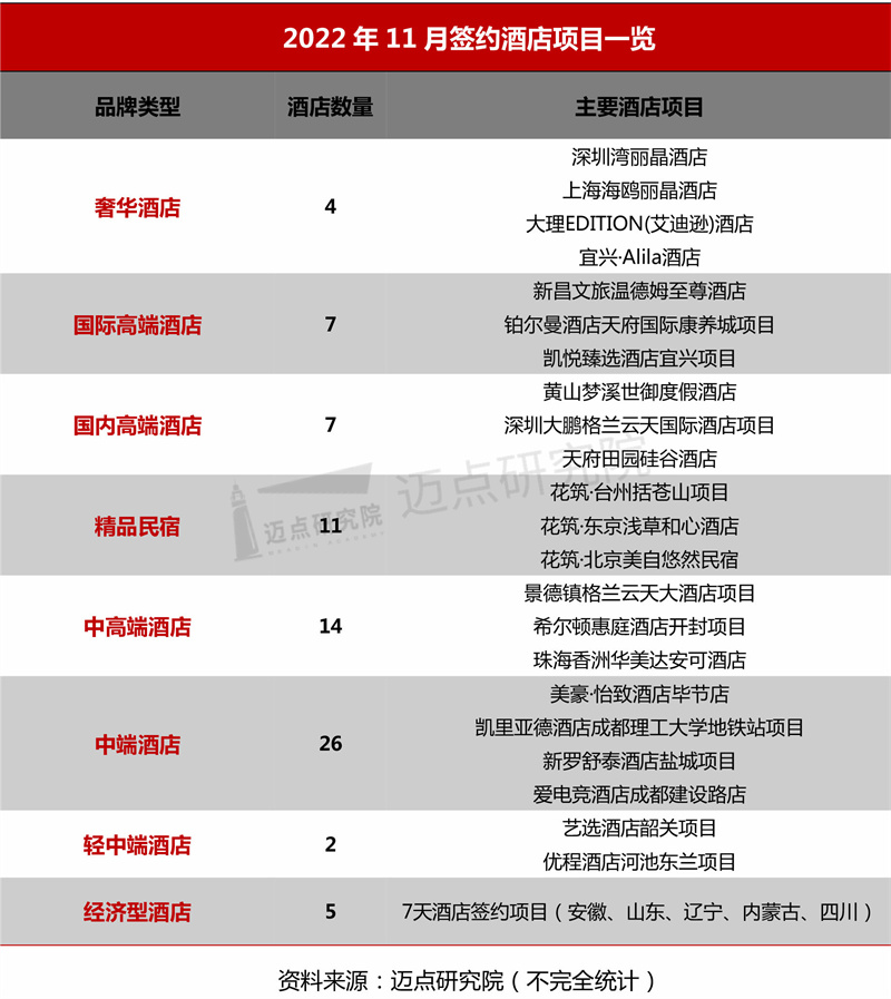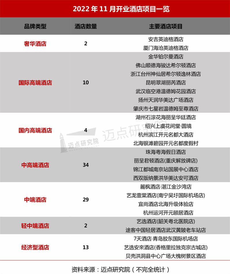 品牌酒店开业:据迈点不完全统计,2022年11月新开业94家酒店,类型横跨全品类。酒店类型占比上,中高端酒店最多,总计为34家,其中曼居酒店、希尔顿惠庭酒店、希尔顿欢朋酒店和朗丽兹酒店开业均突破3家;其次是中端酒店,共29家,维也纳酒店6店齐开;经济型酒店以13家的数量排名第三,其中7天酒店开店数量居于榜首。地域分布上,下沉特色明显,尤以经济型酒店表现最为突出,进军县级城市单元,如贝壳酒店在洪洞县、灌云县开设新店。