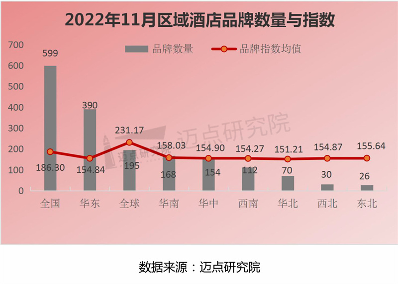 2022年11月区域酒店分布中,全国性品牌数量最多,有599个;其次是华东区域品牌,有390个;再次为全球性品牌,有195个。从各区域酒店品牌指数来看,全球性品牌以绝对性的优势领先,其次分别为全国、华南、东北、华中、西北、华东、西南、华北。各区域品牌指数平均值为166.80,全球性、全国性品牌高于平均值。从品牌指数的环比变化来看,除西北、东北外,其他区域品牌环比均上升,其中全球性品牌上升幅度最大,为8.03%;西北区域酒店品牌下降幅度最大,为-0.18%。