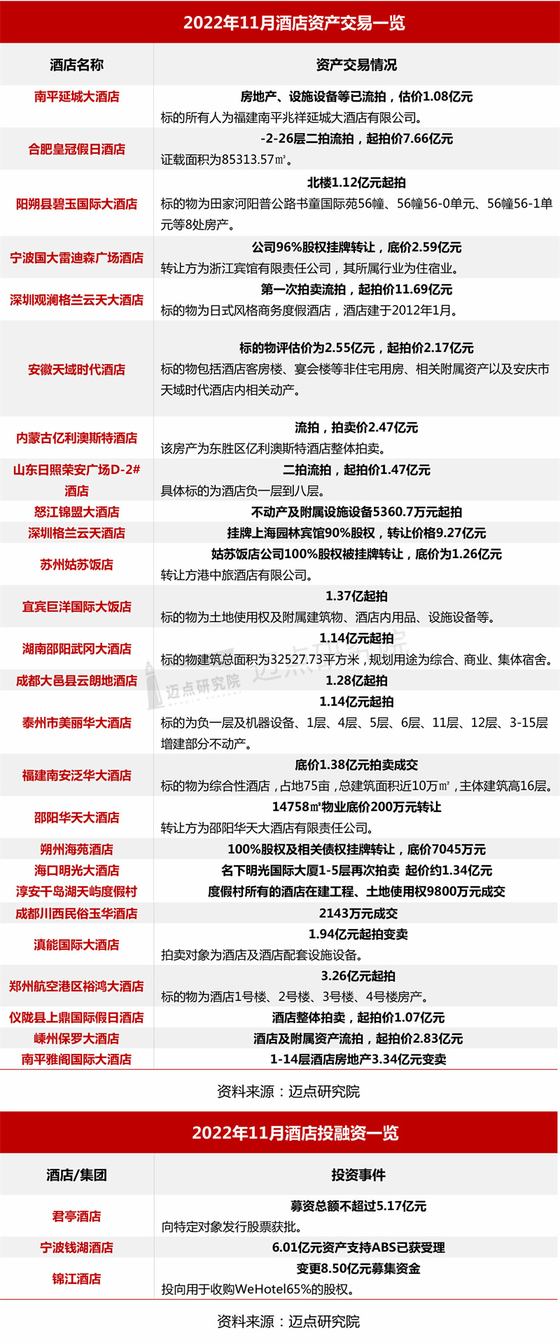 11月,酒店资产交易依然活跃。疫情持续三年,酒店经营现金流承压,各地酒店股权转让、资产出售事件频发。出售酒店可以回笼资金、盘活资产,从重投入转向轻运营,减缓企业负担。另一方面,酒店加大募资,增资补血,谋求业务扩张,如君亭酒店定增募资不超5.17亿元获批,募集资金将用于新增直营酒店投资开发项目和现有酒店装修升级项目,将新增公司直营酒店数量及优化提升现有直营酒店盈利能力。