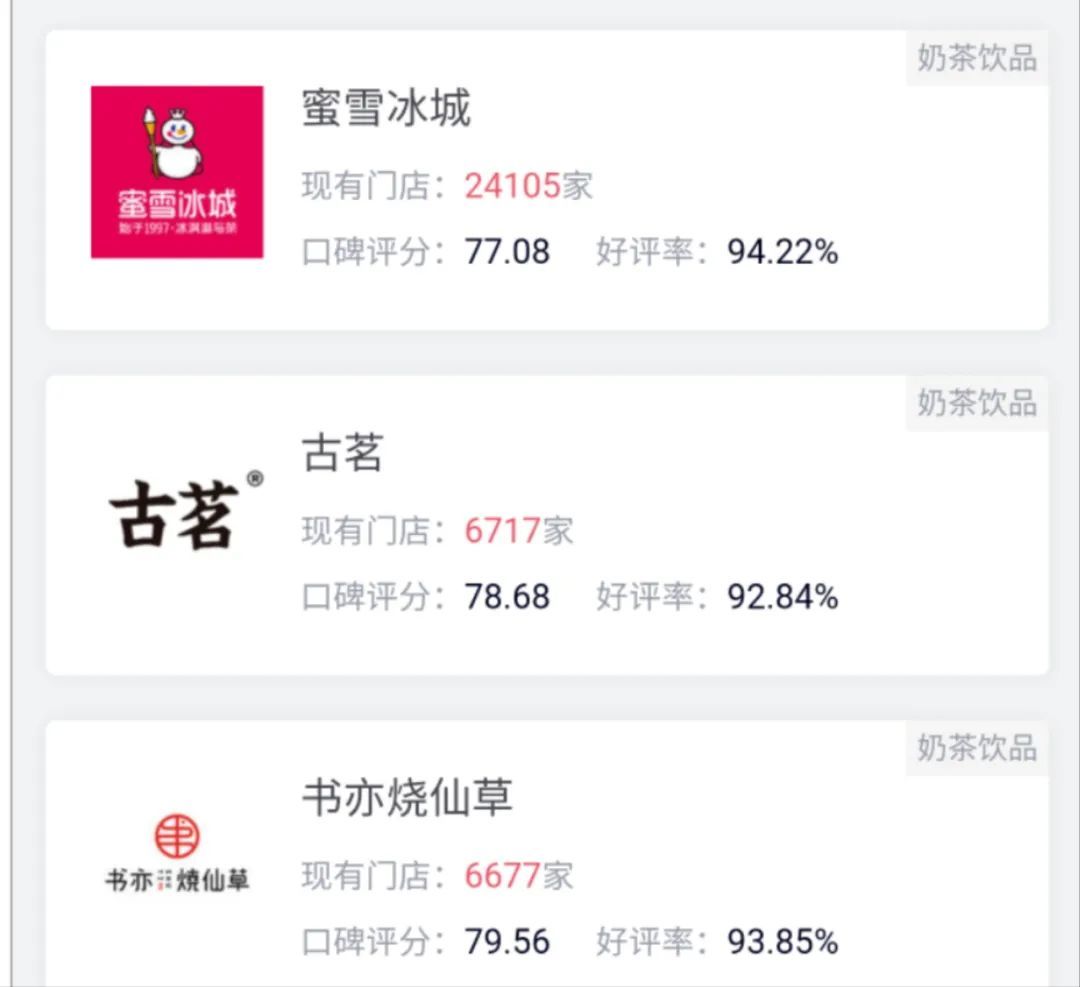 窄门餐眼数据显示,在“奶茶饮品”领域,蜜雪冰城以24105家现有门店数量、月均开店百家的速度,一骑绝尘,在中国版图上可谓“全面开花”,并在这几年开始进攻一二线城市。茶百道、古茗等品牌也在加快开店速度,远超“三小巨头”。