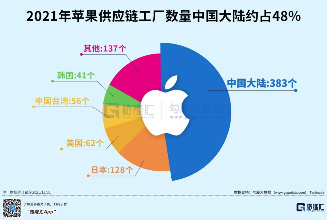 尤其是中国的无数零配件供应商和代工组装的富士康。2021年,苹果供应链工厂中,中国大陆的工厂就有383个,占了48%。