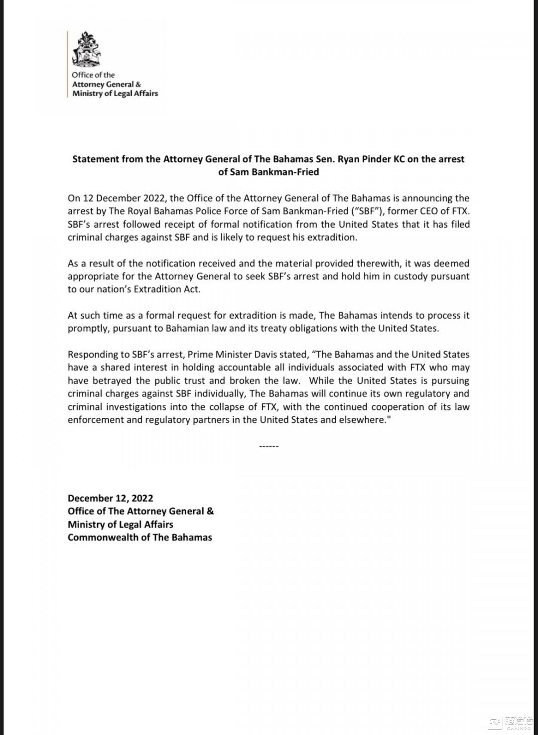 在FTX黑天鹅事件持续发酵后,事件有了最新进展:FTX创始人Sam Bankman-Fried(SBF)在巴哈马被捕。巴哈马总检察长办公室和法律事务部表示,根据SDNY(美国纽约南区法院)提交的密封起诉书,应美国政府要求他们逮捕了Samuel Bankman-Fried(SBF),根据巴哈马的引渡条约拘留SBF之后,未来在美国正式提出引渡申请之时,巴哈马将迅速响应。