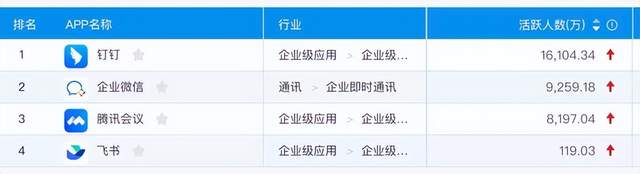 三家的市场格局已初步形成:钉钉>企微>飞书。根据调研机构QuestMobile的数据,2022年9月,钉钉月活用户数2.2亿,企业微信1.1亿,飞书840万。来自易观千帆的数据显示,2022年10月,钉钉的活跃人数达到了1.6亿,企业微信和腾讯会议分别是9000万和8000万以上,飞书最少,为119万。
