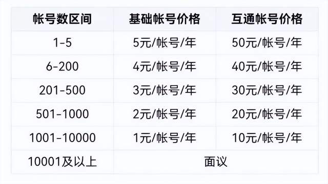 今年5月,企微把收费模式从“抽佣”调整为“卖账号”。以前每次出售产品,向企微缴纳10%的费用,现在是按调用接口的账号数量收费。假如,服务商购买50个互通账号,一年的费用是40x50=2000元。这种模式可以避免“飞单”,防止卖家私下和买家交易。