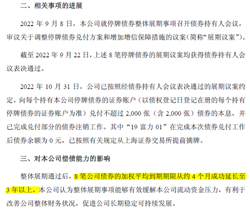 11月10日,富力公告称,境内公司债券整体展期成功,涉及8笔公司债券的加权平均到期期限从约4个月延长至3年以上。