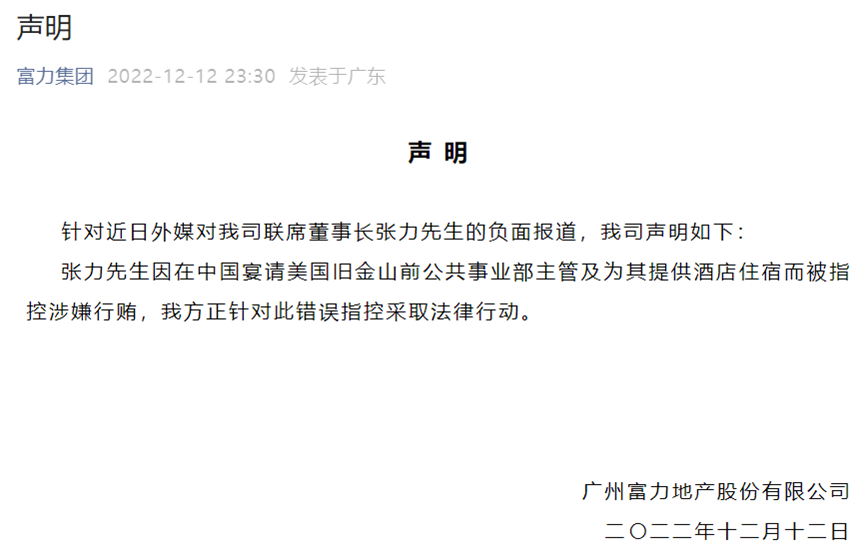 12月12日晚,富力发声明称,联席董事长张力被控涉嫌行贿,原因是在中国宴请美国旧金山前公共事业部主管及为其提供酒店住宿。