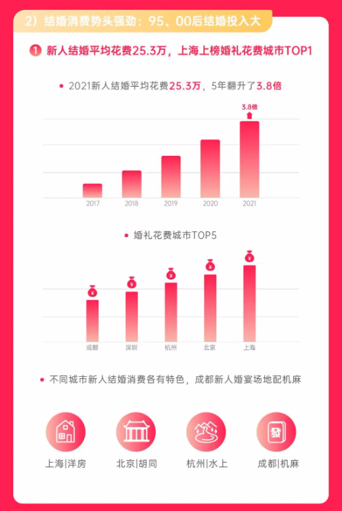 根据《2022婚礼纪春季潮婚节结婚消费趋势洞察》显示,2021年,一对新人的平均结婚花费为25.3万元,5年翻升了3.8倍。