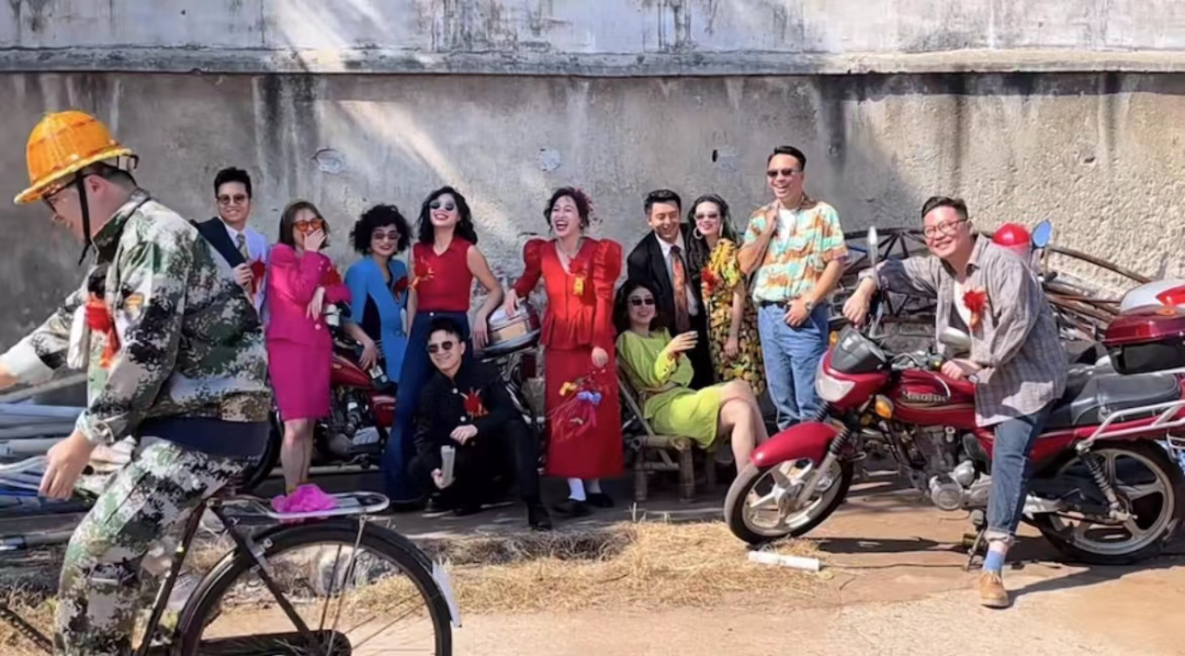 依靠左邻右舍借来的二八大杠、豪爵铃木、豪爵钻豹,紧接着穿上一起约定好的古着礼服、黄色套装、绿色套装、花衬衫、大波浪,再带上Bb机、大哥大。