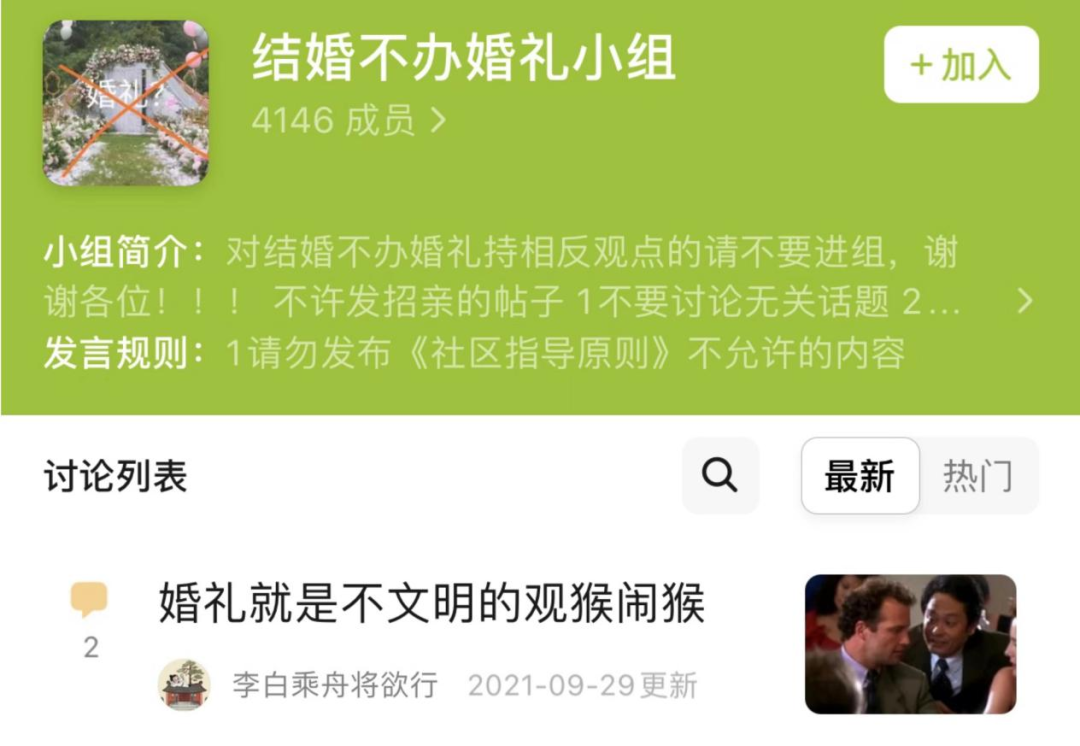 例如豆瓣 “结婚不办婚礼小组”里,年轻人所积极讨论不办婚礼的理由里,除了不想铺张浪费、攀比心理、不想像演员一样被围观、受不了煽情以外,认为传统婚礼交接仪式犹如是女性所有权从父权向夫权的转移仪式。