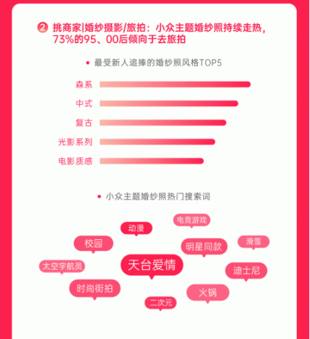 根据《2022婚礼纪春季潮婚节结婚消费趋势洞察》研究发现,滑雪、二次元、电竞游戏、太空宇航员、动漫等主题婚纱照已经成各大社交平台热门搜索关键词。