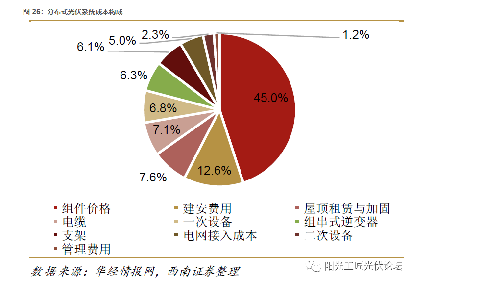 光伏系统成本中,组件占比高达45%。2023年,硅料释放产能带动产业链降价传导到组件,光伏成本将进一步降低。