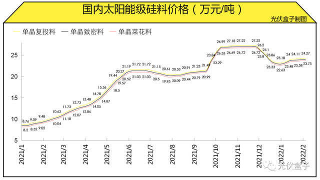 随后隆基继续降价,多晶硅价格也同步下降,一个月内,价格从27.22万元/吨下跌到22.63万元/吨。