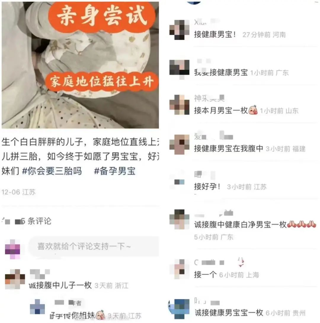 一些颇为荒诞的对话也可以在互联网上看到,当一位孕妇晒出自己的照片并得到“祝你生个女孩”的评价后,她激动且愤怒地回怼道:“你就不配做个女人。”而一旦有人晒出自己最终生下了男孩的照片,就会有大批量的孕妇同时在评论区下“接男宝”,场面蔚为壮观。![]()