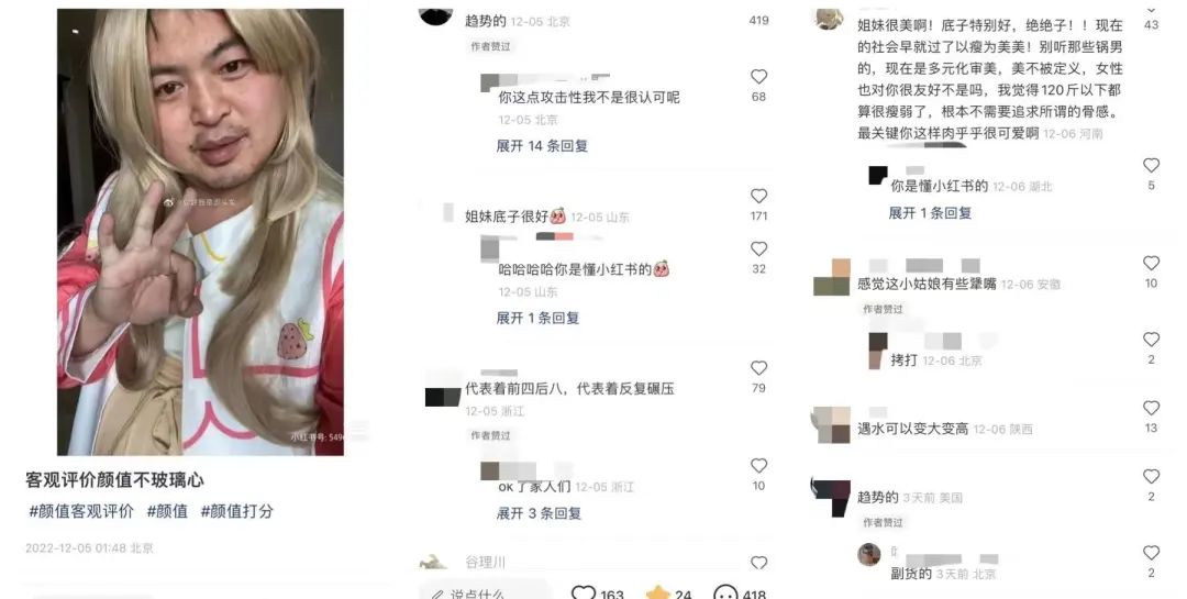 除此之外,部分男性用户也会主动“进攻”小红书,他们会主动“反串”,发布一些并不属于本人的照片去制造一些戏剧效果,解构社区中原本的和谐场面。亦或者将一些女性用户并不了解的抽象网红的照片搬运至小红书,以当事人的口吻求打分,希望看到有不明所以的女性用户被钓鱼,最终给出一个奇特的评价,成功达成引战的效果。